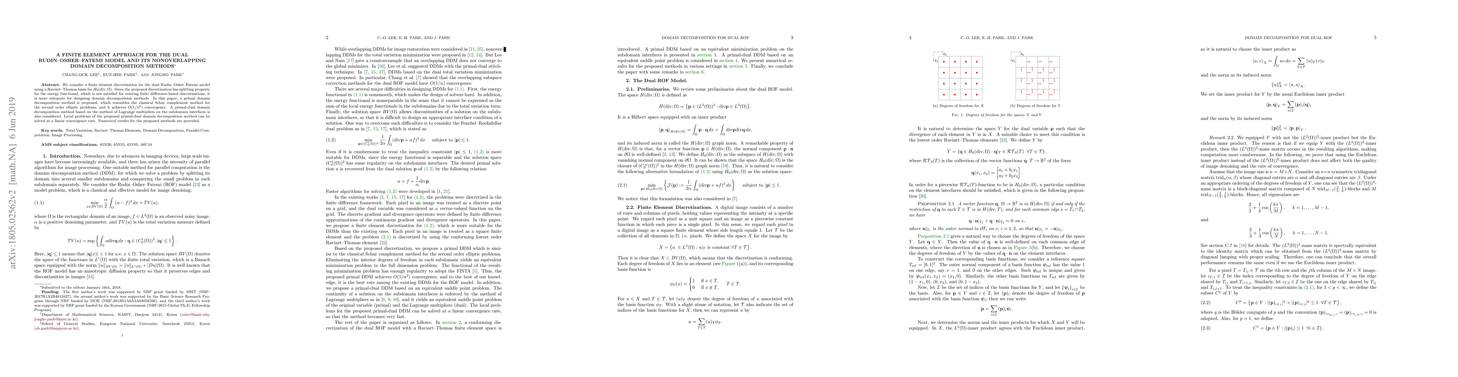 This paper presents a finite element discretization for the dual Rudin-Osher-Fatemi model using Raviart-Thomas basis, which allows for effective domain decomposition methods. It proposes both primal and primal-dual decomposition methods achieving $O(1/n^2)$ and linear convergence rates, respectively, with numerical results validating the effectiveness of the proposed approaches.
