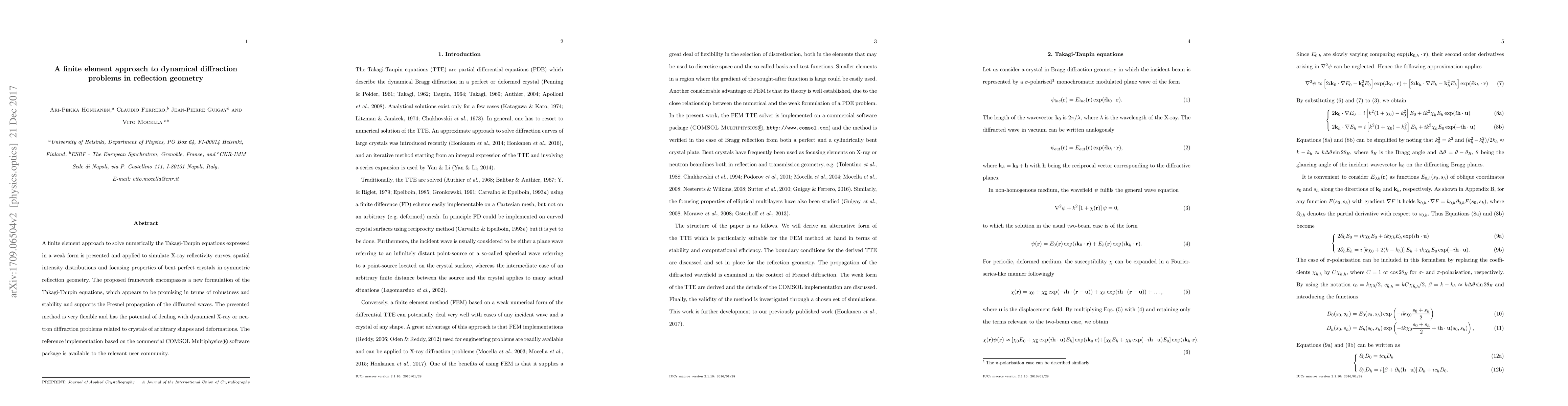 This paper presents a finite element method for solving the Takagi-Taupin equations in a weak form to simulate X-ray diffraction phenomena, including reflectivity curves and intensity distributions in bent perfect crystals. The new formulation offers robustness and stability, supporting Fresnel propagation and flexibility for various crystal shapes and deformations.