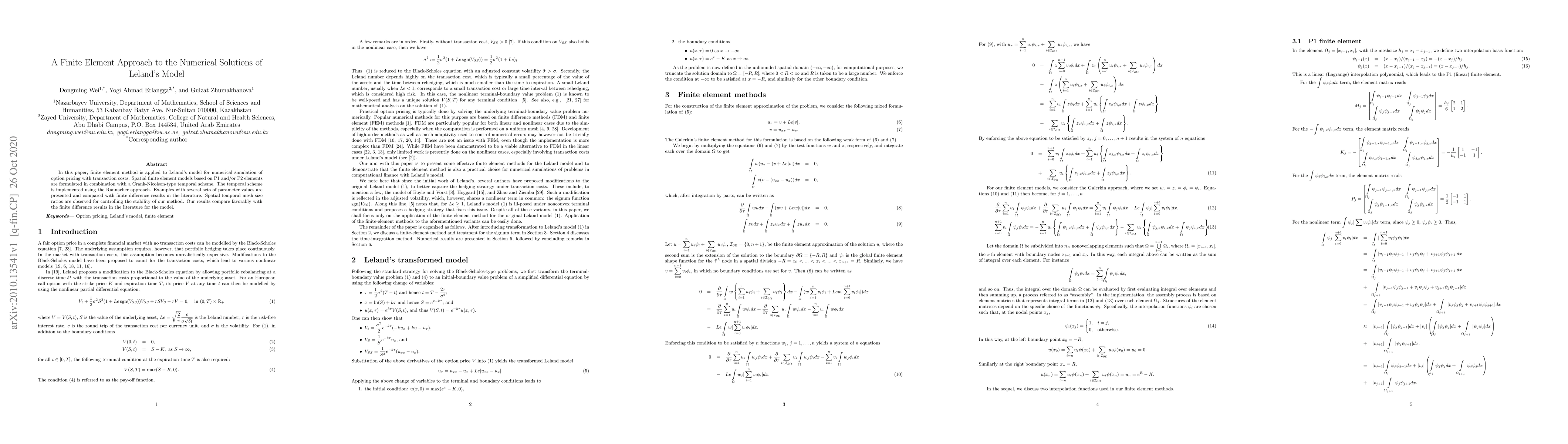 This paper applies the finite element method to Leland's option pricing model with transaction costs, using P1 and P2 elements combined with a Crank-Nicolson temporal scheme. Results are stable with appropriate mesh-size ratios, comparing favorably with existing finite difference methods.