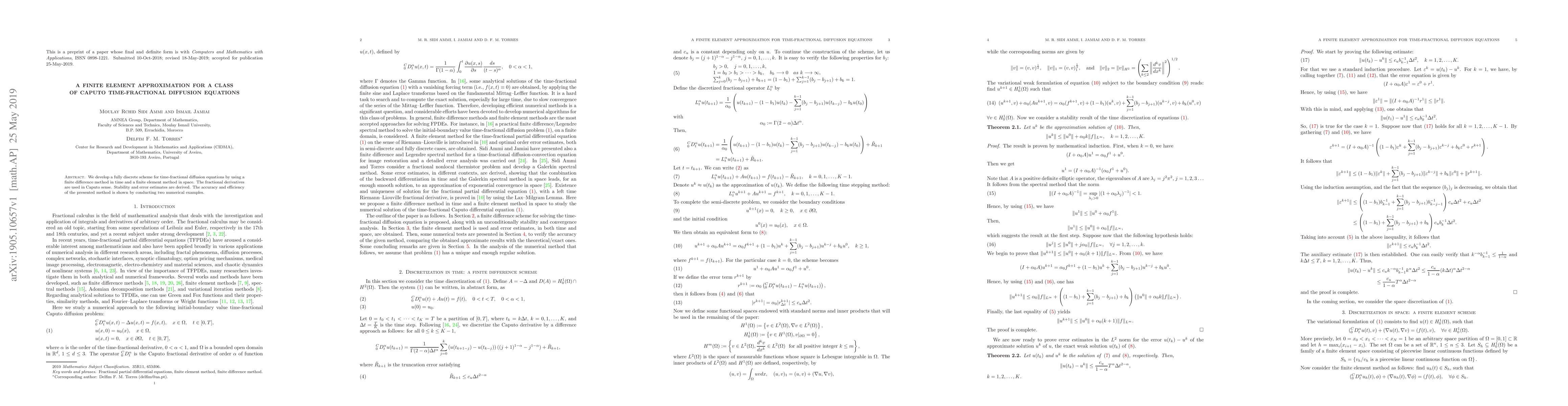 This paper proposes a fully discrete finite element method for solving Caputo time-fractional diffusion equations, combining finite differences in time and finite elements in space. Stability and error estimates are derived, and the method's accuracy and efficiency are demonstrated through numerical examples.