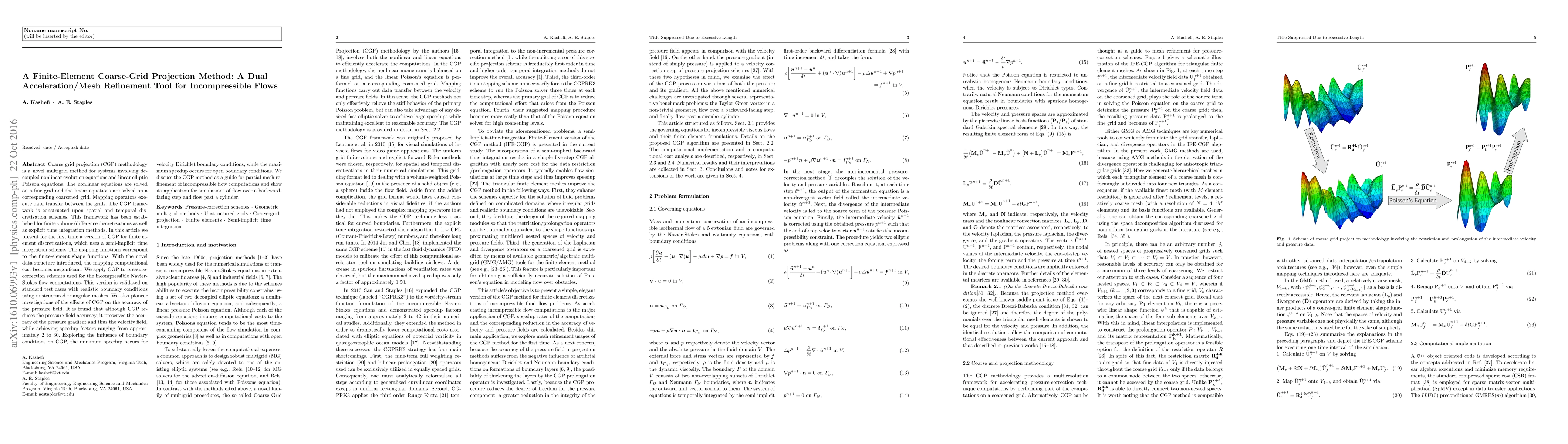 This paper introduces a finite-element coarse-grid projection method for accelerating incompressible flow simulations, achieving speedup factors from 2 to 30 while maintaining velocity field accuracy. The method is validated on standard test cases and shows varying speedups based on boundary conditions.