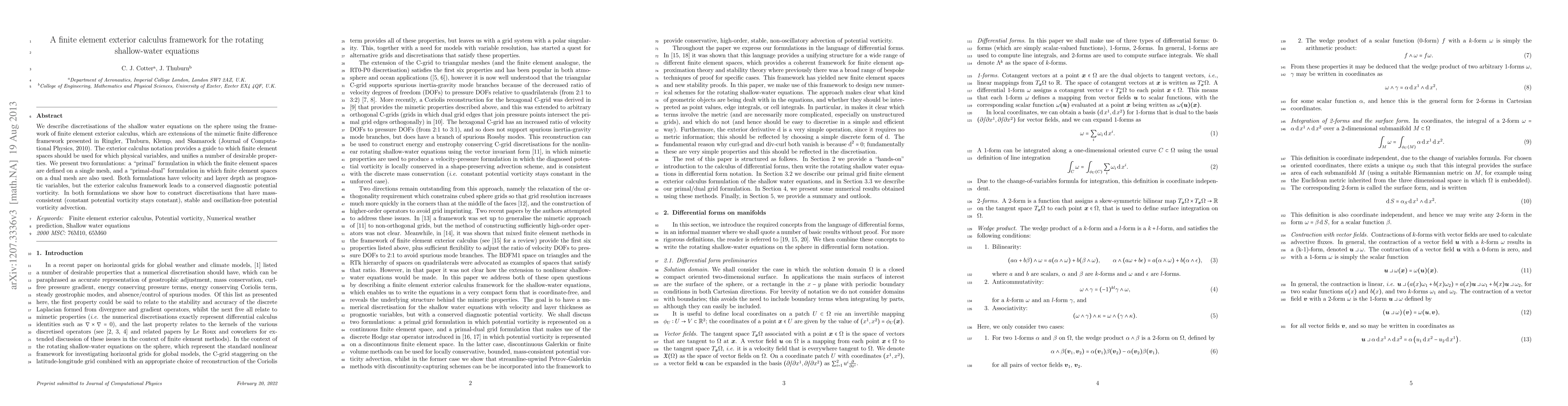 This paper presents finite element exterior calculus frameworks for discretizing the rotating shallow-water equations on a spherical domain, offering two formulations: primal and primal-dual. The approach ensures mass consistency, stable potential vorticity advection, and conserves diagnostic potential vorticity.