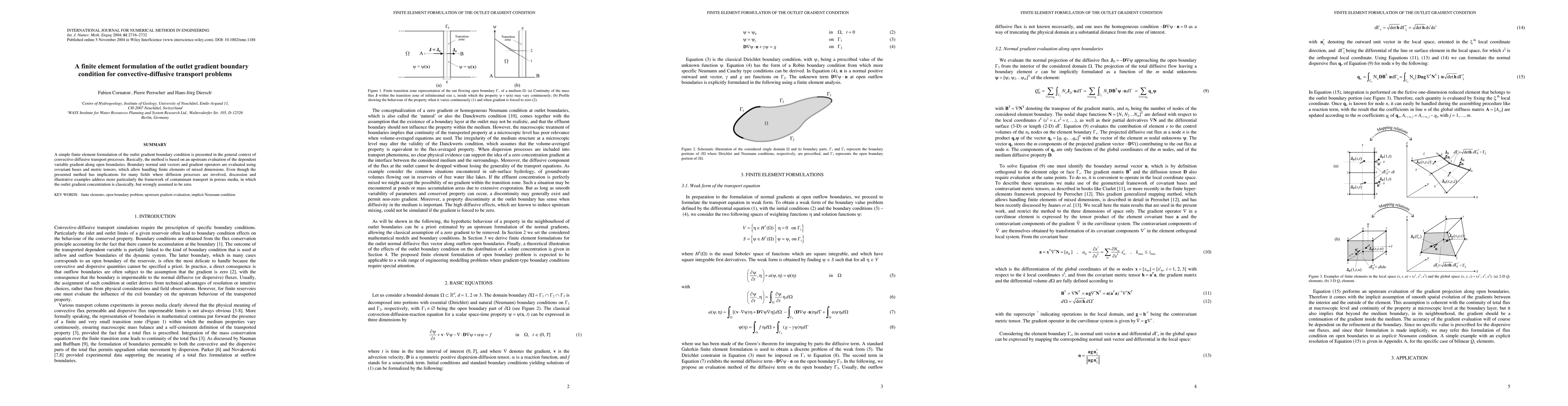 A simple finite element formulation of the outlet gradient boundary condition is presented in the general context of convective-diffusive transport processes. Basically, the method is based on an upstream evaluation of the dependent variable gradient along open boundaries. Boundary normal unit vectors and gradient operators are evaluated using covariant bases and metric tensors, which allow handling finite elements of mixed dimensions. Even though the presented method has implications for many fields where diffusion processes are involved, discussion and illustrative examples address more particularly the framework of contaminant transport in porous media, in which the outlet gradient concentration is classically, but wrongly assumed to be zero.