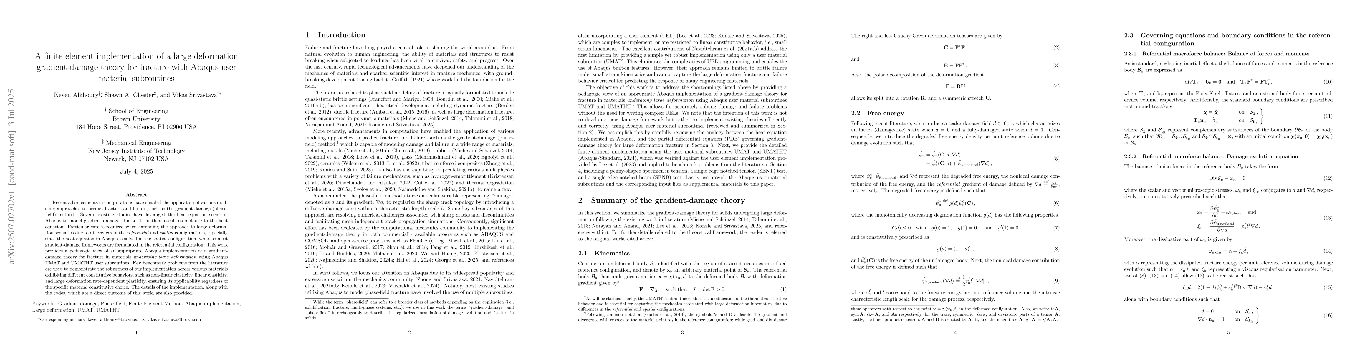 The paper provides a detailed Abaqus implementation of gradient-damage theory for large deformation fracture using UMAT and UMATHT, along with a comprehensive validation against benchmark problems.