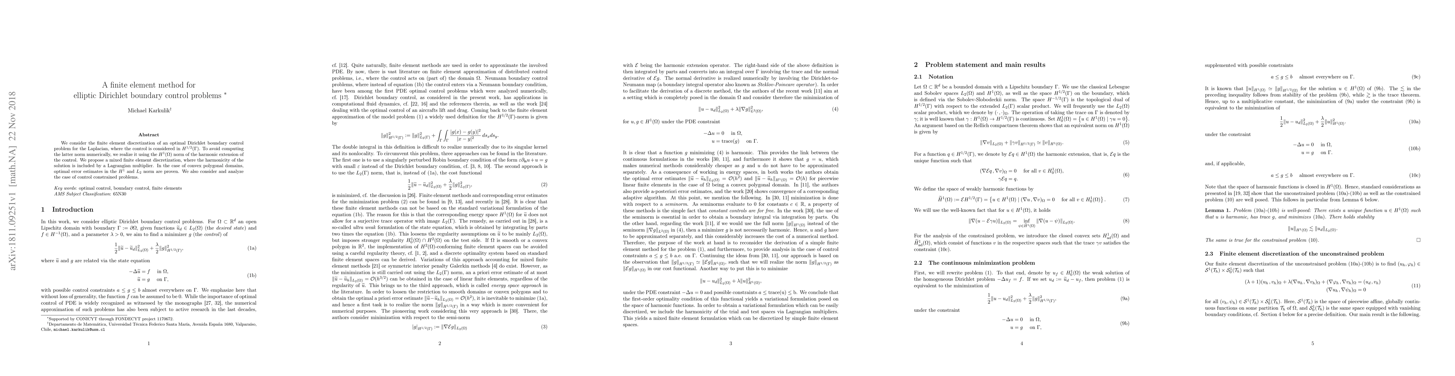 This paper proposes a finite element method for solving optimal Dirichlet boundary control problems for the Laplacian, utilizing a mixed discretization approach with a Lagrangian multiplier to enforce harmonicity. Optimal error estimates are proven for convex polygonal domains, and the case of control constrained problems is also analyzed.