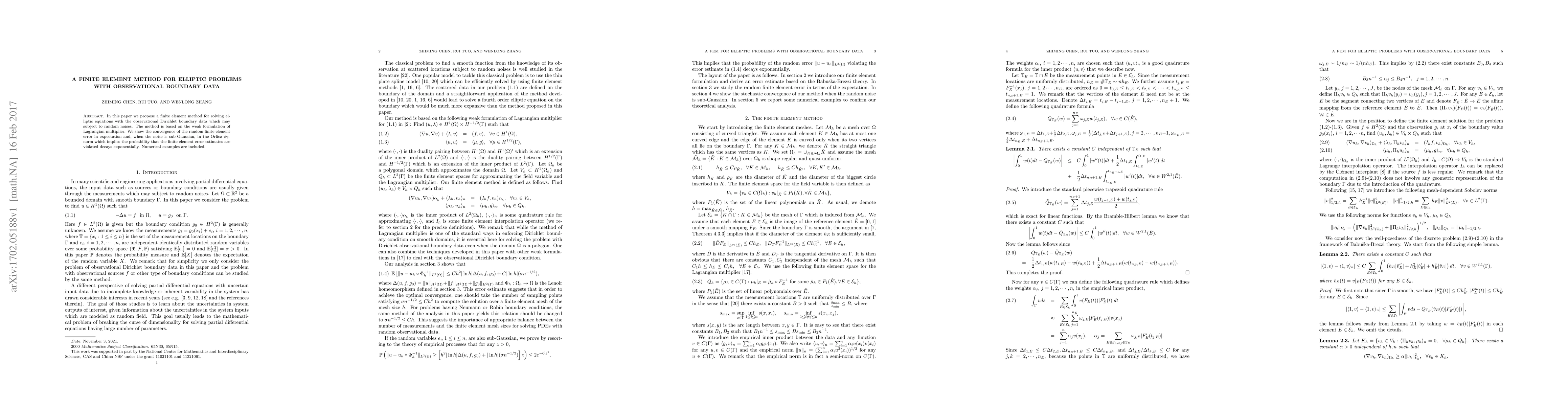 This paper proposes a finite element method for elliptic equations with noisy observational Dirichlet boundary data, based on a weak formulation using Lagrangian multipliers. The method demonstrates convergence in expectation and sub-Gaussian noise scenarios, with exponentially decaying probability of error estimate violations.