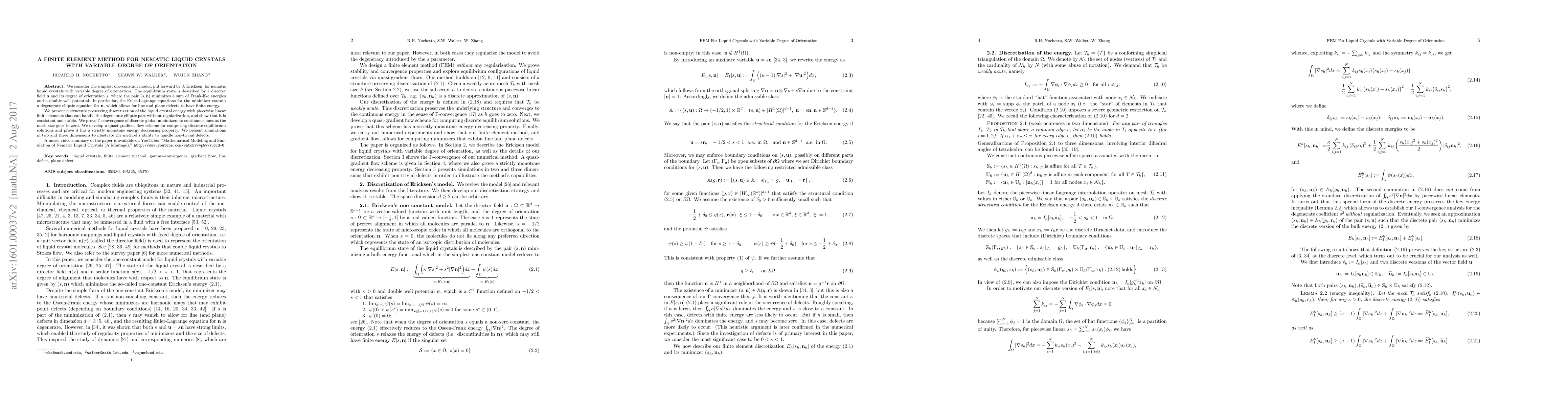 This paper develops a finite element method for modeling nematic liquid crystals with variable orientation, focusing on a one-constant model by J. Ericksen. It presents a consistent and stable discretization method that handles degenerate elliptic equations without regularization, proving $\Gamma$-convergence and a monotone energy decreasing property in simulations.