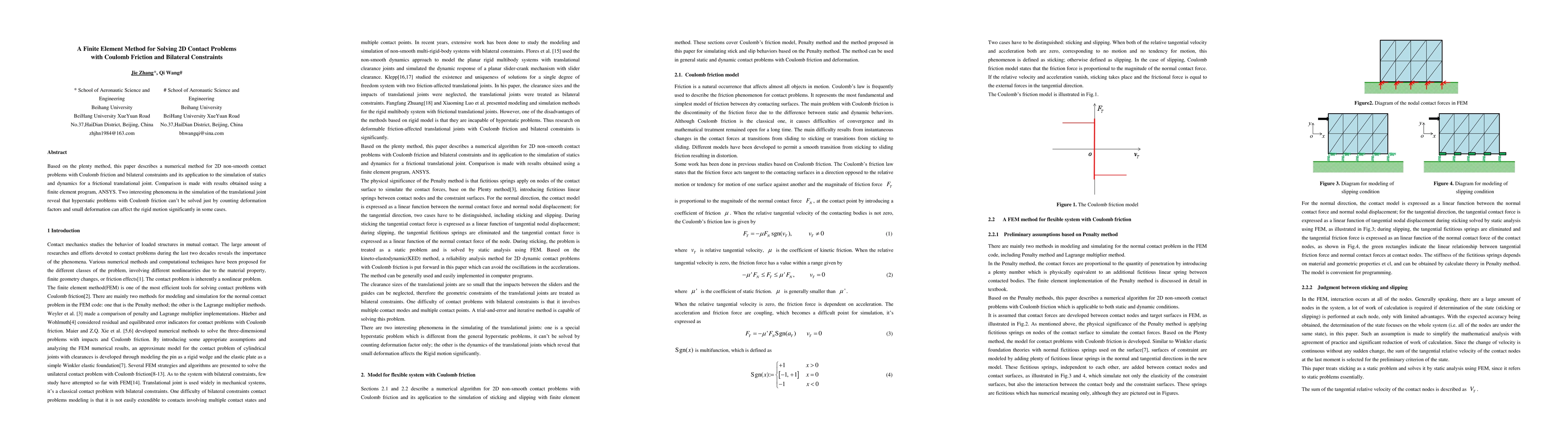 This paper proposes a finite element method for solving 2D contact problems involving Coulomb friction and bilateral constraints, demonstrating its application in simulating statics and dynamics of frictional translational joints. Results are compared with those from ANSYS, showing the method's effectiveness.
