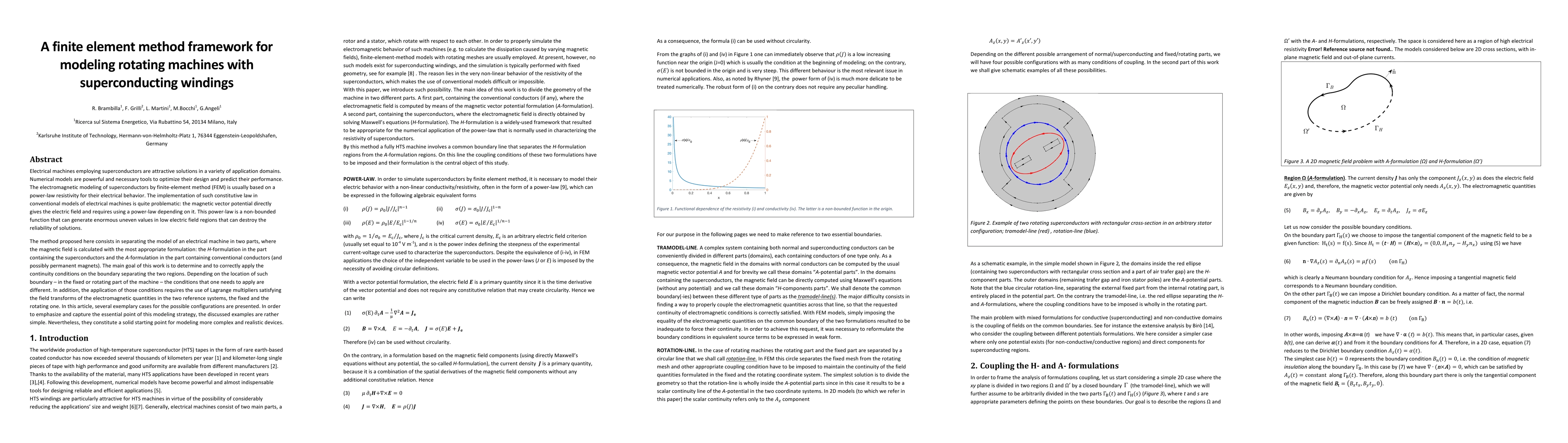 This paper presents a finite element method (FEM) framework for modeling rotating machines with superconducting windings, addressing the challenges of implementing a power-law resistivity model. It proposes a dual-formulation approach using H-formulation for superconductors and A-formulation for conventional conductors, focusing on accurately applying continuity conditions and Lagrange multipliers across the boundary between these regions.