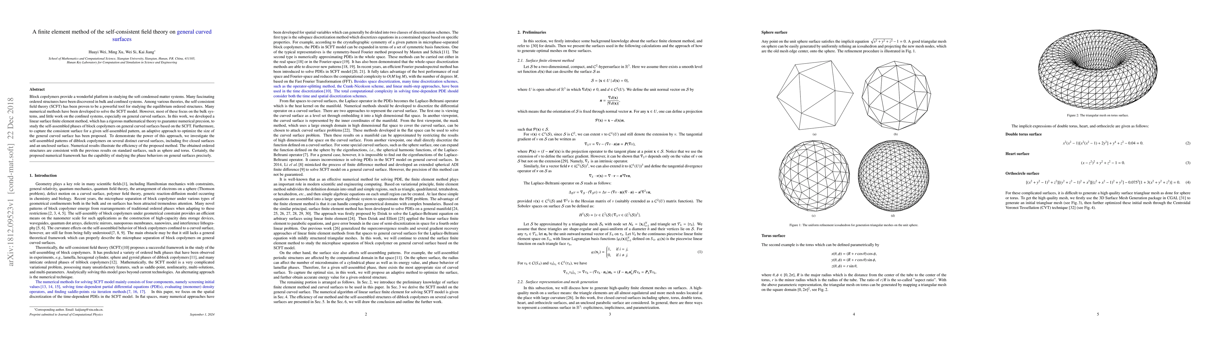 The research employs a linear surface finite element method to solve the self-consistent field theory (SCFT) model for studying the self-assembly behavior of block copolymers on general curved surfaces. The method optimizes the surface size during iteration to capture the characteristic scale of a given self-assembled structure and provides a more accurate effective Hamiltonian value.