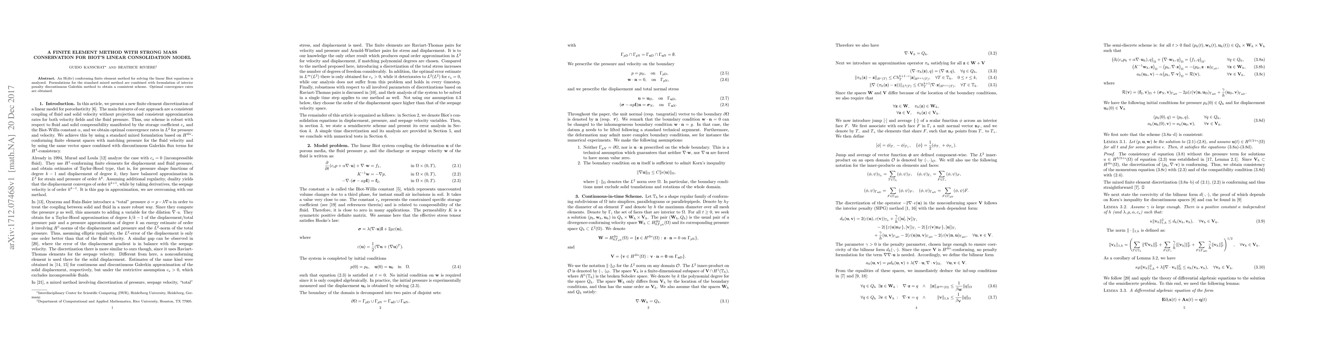A new finite element method is developed to solve Biot's linear consolidation model with strong mass conservation, achieving optimal convergence rates.