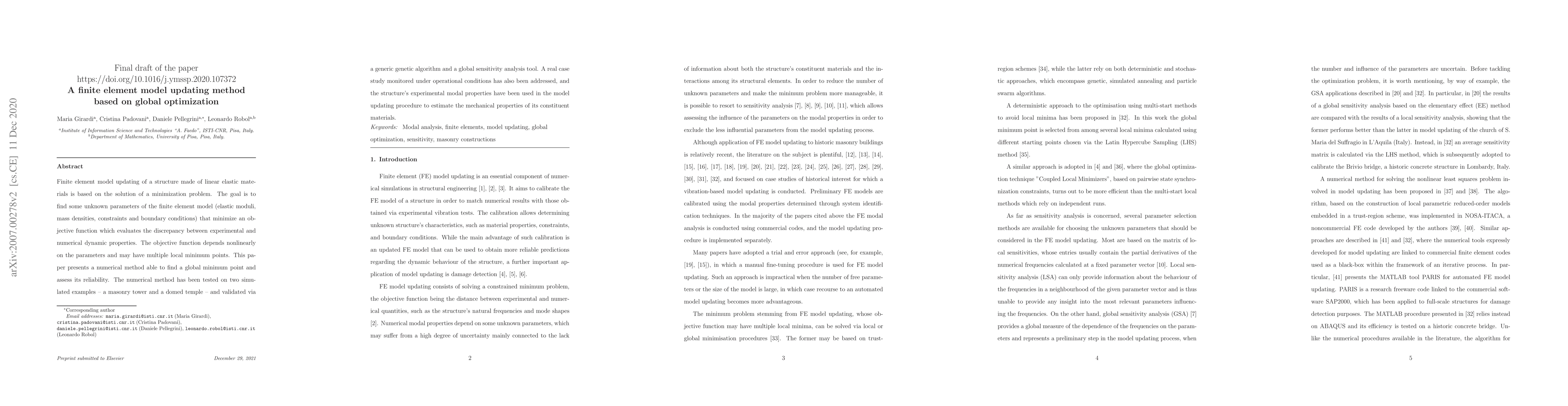 Researchers developed a method to update finite element models of structures using global optimization to minimize discrepancies between experimental and numerical properties. The method was tested on simulated examples and validated with real-world data, showing its reliability in estimating mechanical properties.