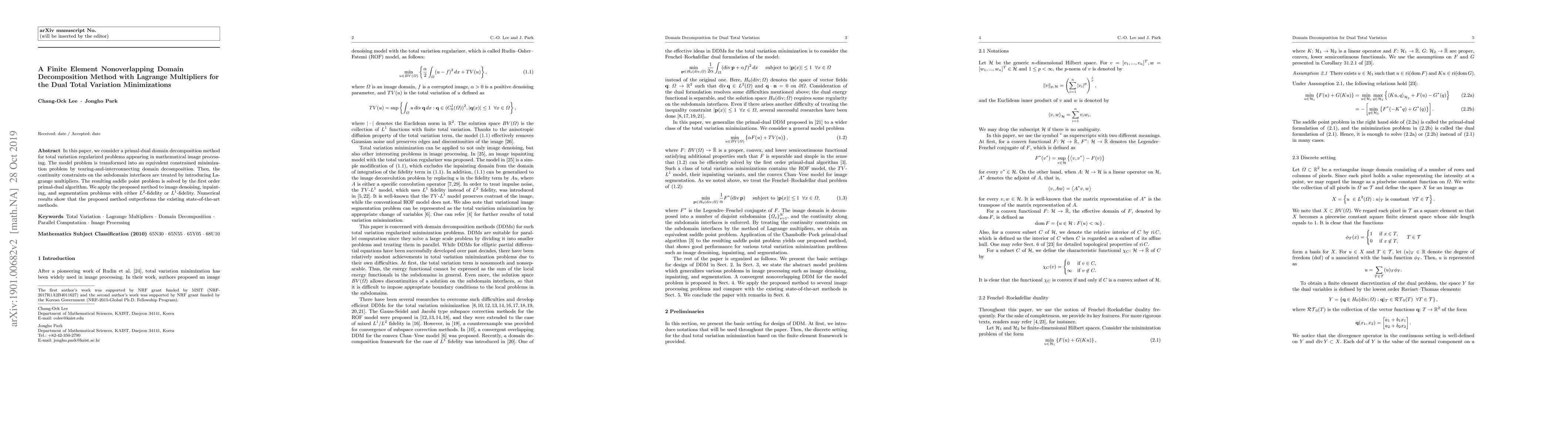This paper proposes a finite element nonoverlapping domain decomposition method with Lagrange multipliers for dual total variation minimizations in image processing. The method is applied to image denoising, inpainting, and segmentation, demonstrating superior performance compared to existing techniques.