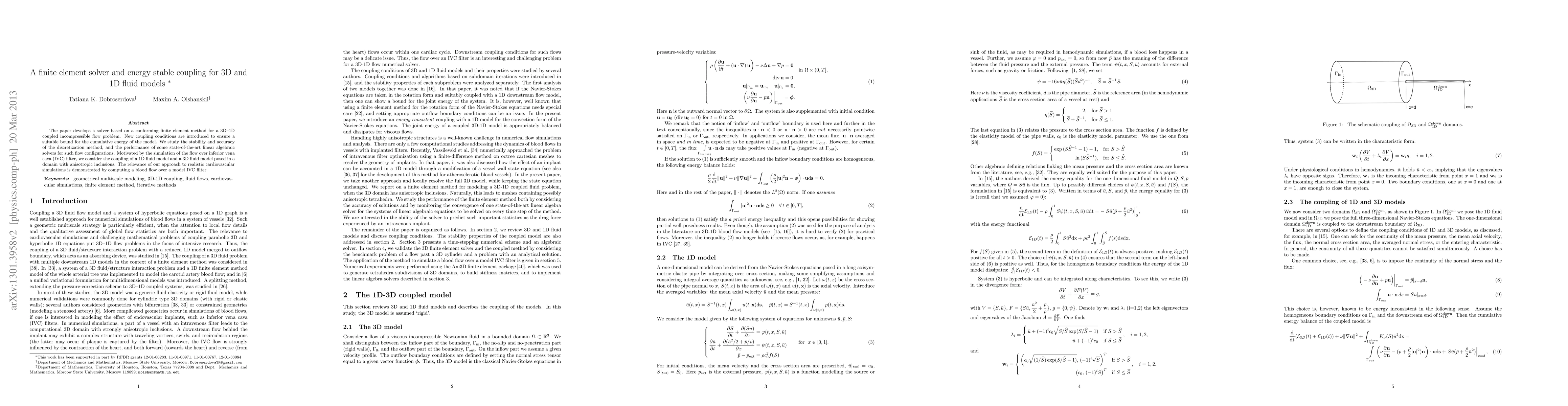 A new finite element solver is developed for 3D-1D fluid models with energy stable coupling conditions to ensure accurate results, particularly relevant for simulating blood flow over inferior vena cava filters.