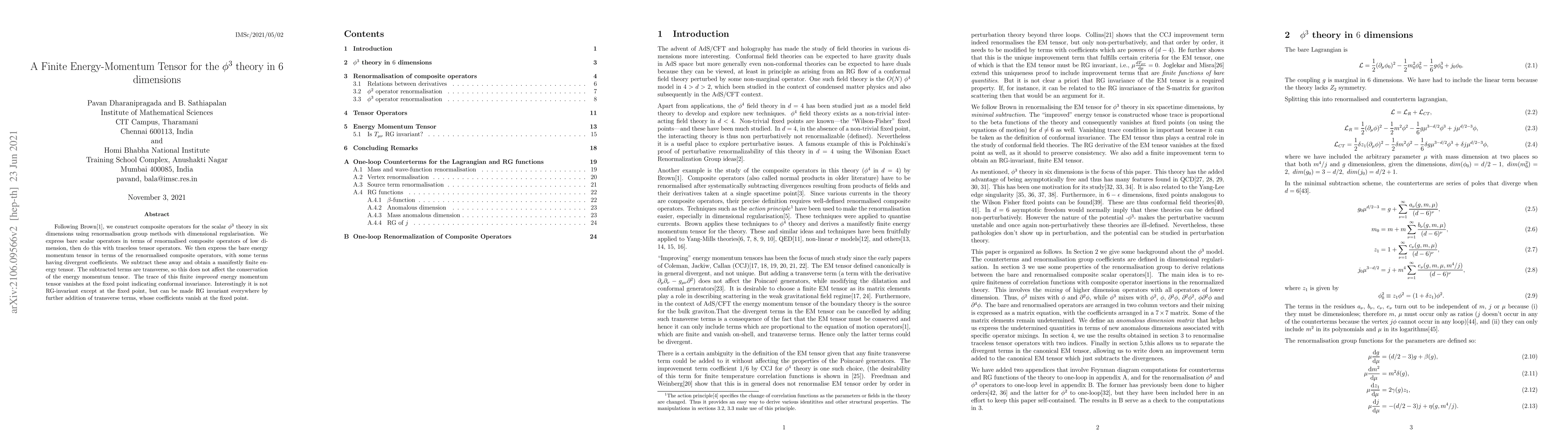 This paper constructs a finite energy-momentum tensor for the $\phi^3$ scalar theory in six dimensions using renormalization group methods. It achieves a manifestly finite tensor by subtracting divergent terms, preserving conservation laws, and indicates conformal invariance at the fixed point.