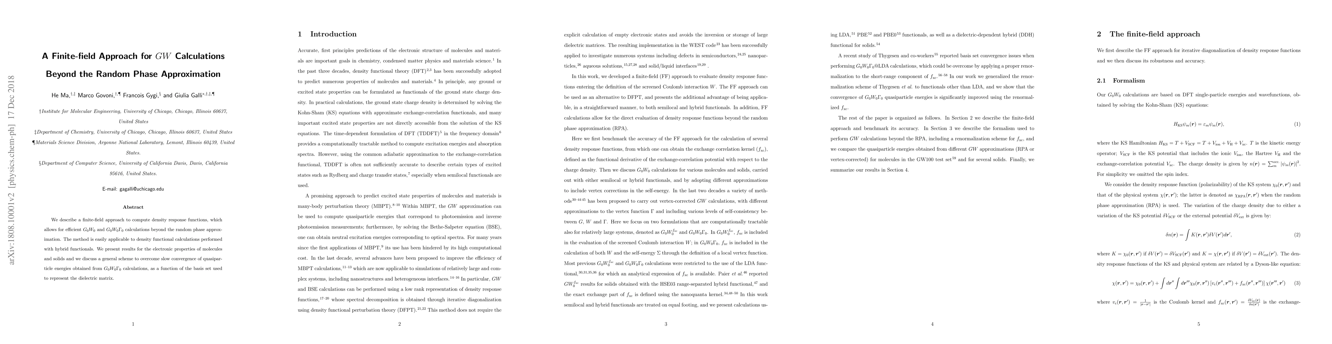 We describe a finite-field approach to compute density response functions, which allows for efficient $G_0W_0$ and $G_0W_0\Gamma_0$ calculations beyond the random phase approximation. The method is easily applicable to density functional calculations performed with hybrid functionals. We present results for the electronic properties of molecules and solids and we discuss a general scheme to overcome slow convergence of quasiparticle energies obtained from $G_0W_0\Gamma_0$ calculations, as a function of the basis set used to represent the dielectric matrix.