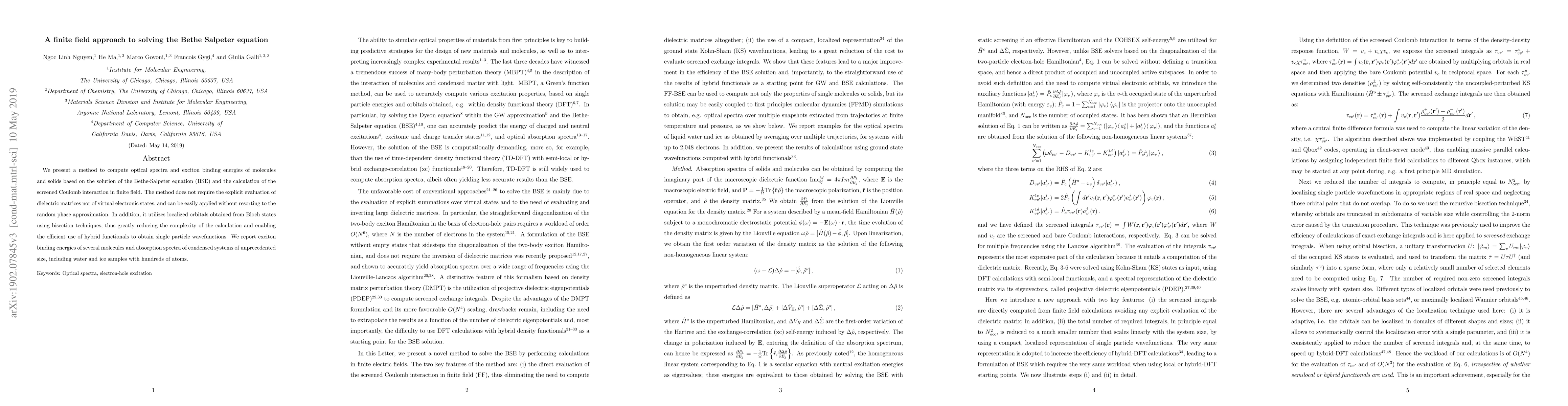 We present a method to compute optical spectra and exciton binding energies of molecules and solids based on the solution of the Bethe-Salpeter equation (BSE) and the calculation of the screened Coulomb interaction in finite field. The method does not require the explicit evaluation of dielectric matrices nor of virtual electronic states, and can be easily applied without resorting to the random phase approximation. In addition it utilizes localized orbitals obtained from Bloch states using bisection techniques, thus greatly reducing the complexity of the calculation and enabling the efficient use of hybrid functionals to obtain single particle wavefunctions. We report exciton binding energies of several molecules and absorption spectra of condensed systems of unprecedented size, including water and ice samples with hundreds of atoms.