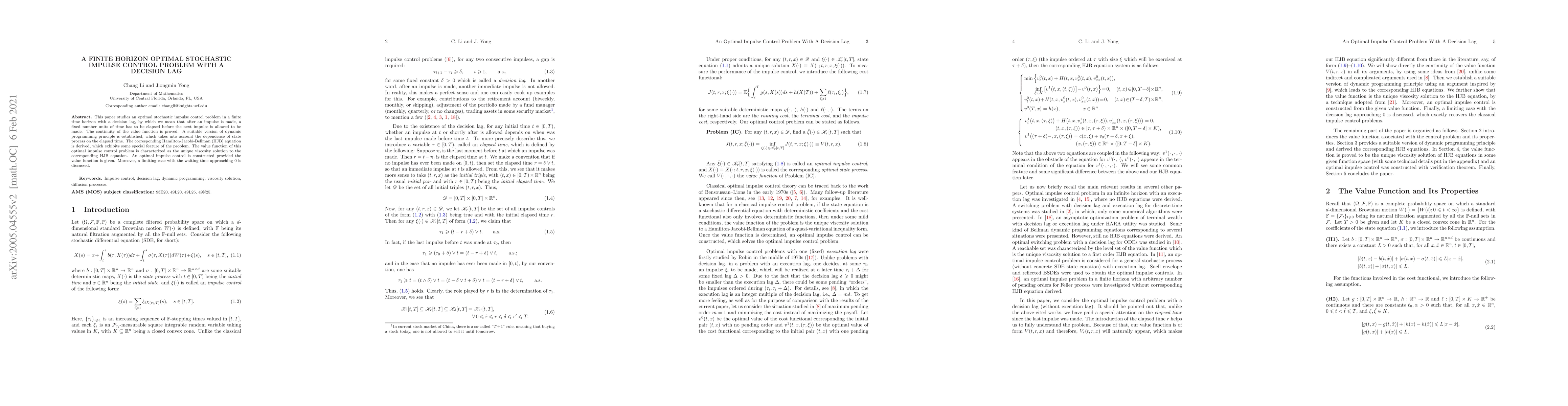 This paper explores an optimal stochastic impulse control problem in a finite horizon with a decision lag, proving the continuity of the value function and establishing a dynamic programming principle. It derives a Hamilton-Jacobi-Bellman equation characterizing the value function as the unique viscosity solution, and discusses the limiting case as the waiting time approaches zero.
