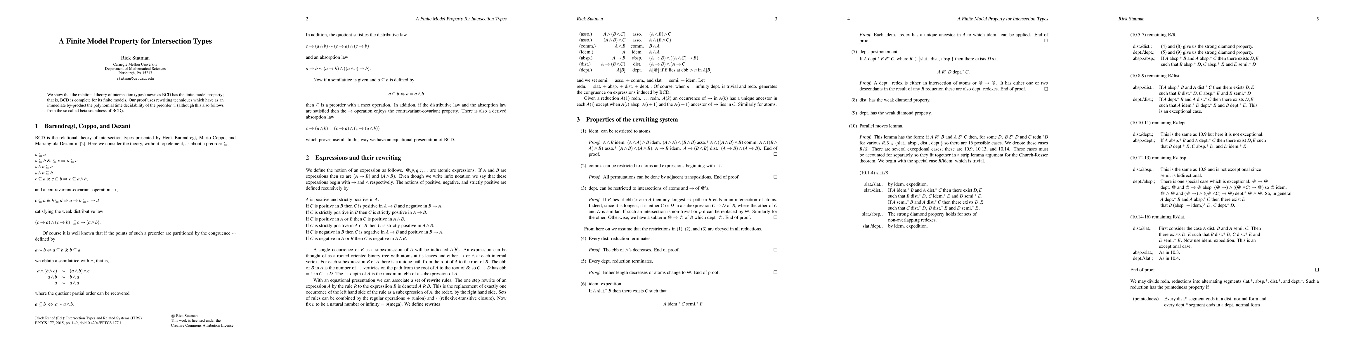 Summary: The paper demonstrates that the BCD intersection type system has the finite model property, meaning it is complete for its finite models, and proves this using rewriting techniques, which also yield the polynomial time decidability of the <= preorder.