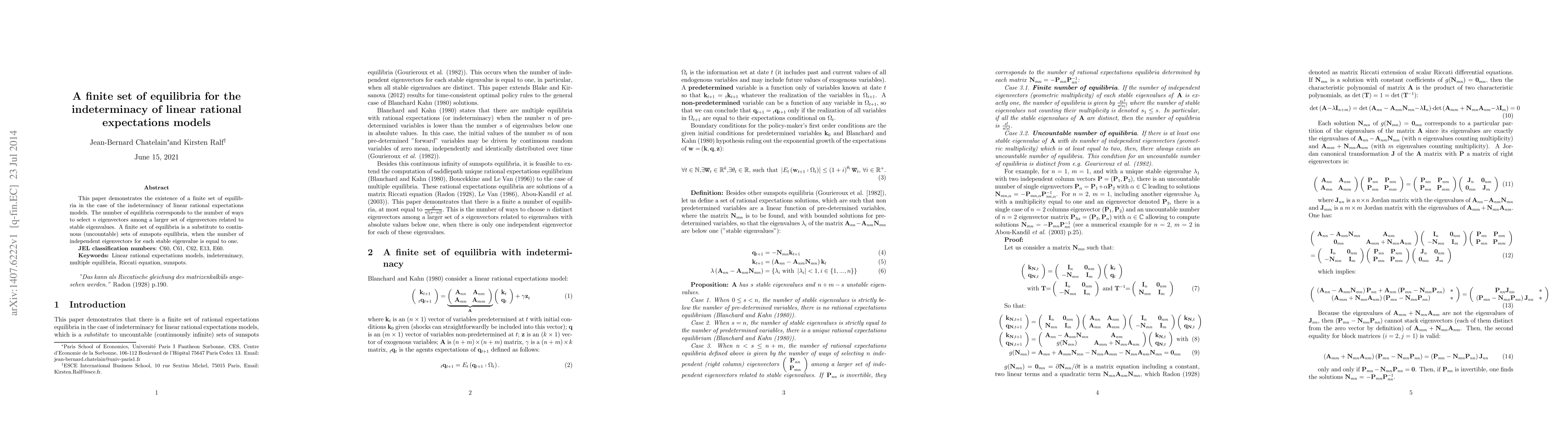 This paper demonstrates the existence of a finite set of equilibria in the case of the indeterminacy of linear rational expectations models. The number of equilibria corresponds to the number of ways to select n eigenvectors among a larger set of eigenvectors related to stable eigenvalues. A finite set of equilibria is a substitute to continuous (uncountable) sets of sunspots equilibria, when the number of independent eigenvectors for each stable eigenvalue is equal to one.