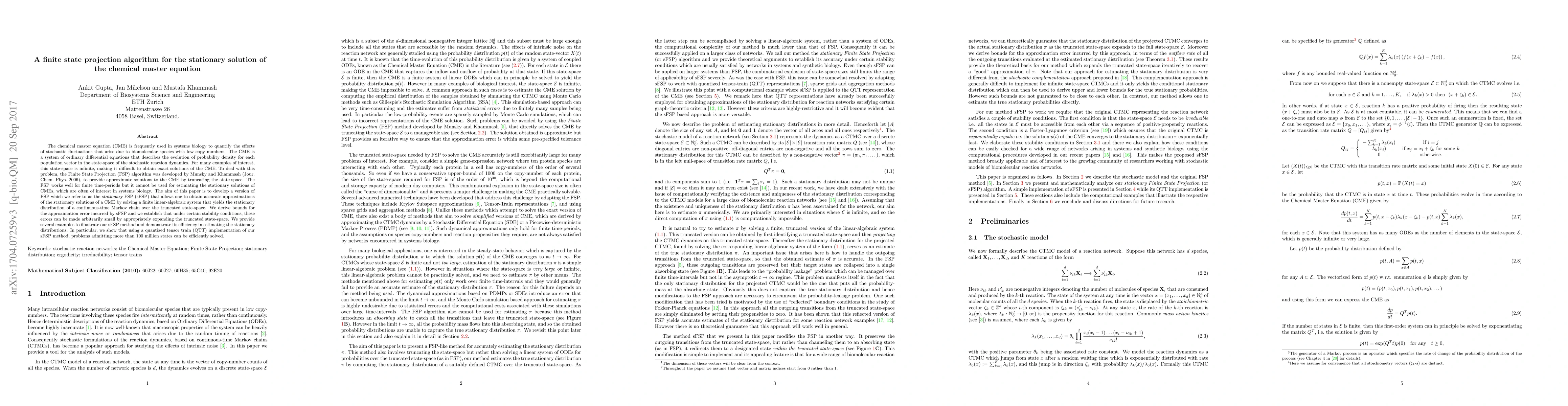 This paper introduces a stationary Finite State Projection (sFSP) algorithm to approximate the stationary solutions of the chemical master equation (CME), addressing the limitations of the original FSP method. The sFSP algorithm solves a finite linear-algebraic system to yield accurate stationary distributions, with error bounds and conditions for minimizing these errors.