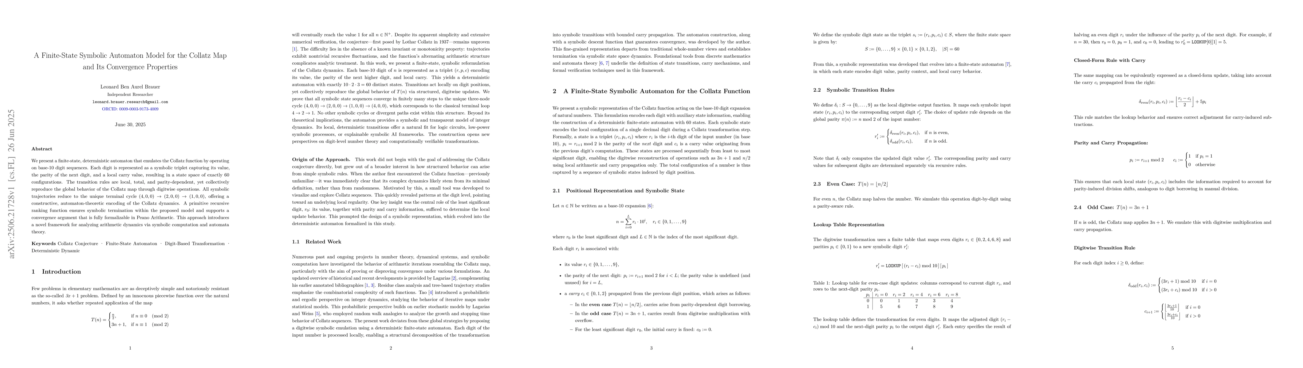 We present a finite-state, deterministic automaton that emulates the Collatz function by operating on base-10 digit sequences. Each digit is represented as a symbolic triplet capturing its value, the parity of the next digit, and a local carry value, resulting in a state space of exactly 60 configurations. The transition rules are local, total, and parity-dependent, yet collectively reproduce the global behavior of the Collatz map through digitwise operations. All symbolic trajectories reduce to the unique terminal cycle (4, 0, 0) -> (2, 0, 0) -> (1, 0, 0), offering a constructive, automaton-theoretic encoding of the Collatz dynamics. A primitive recursive ranking function ensures symbolic termination within the proposed model and supports a convergence argument that is fully formalizable in Peano Arithmetic. This approach introduces a novel framework for analyzing arithmetic dynamics via symbolic computation and automata theory.