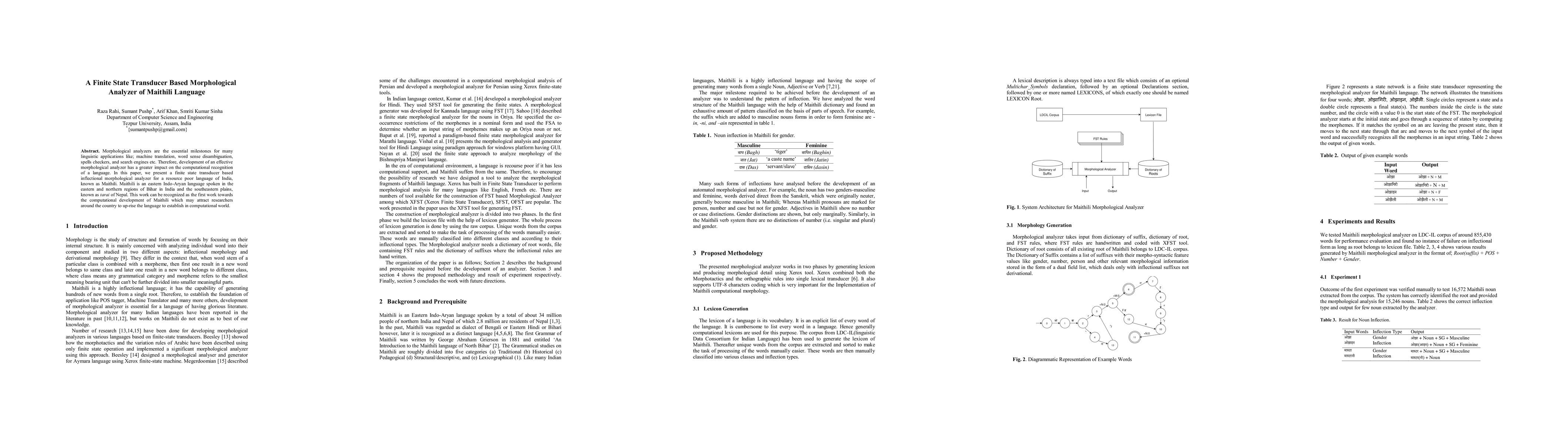 This paper introduces a finite state transducer-based morphological analyzer for the Maithili language, a resource-poor eastern Indo-Aryan language spoken in parts of India and Nepal. This pioneering work aims to facilitate computational recognition and applications like machine translation and search engines for Maithili.