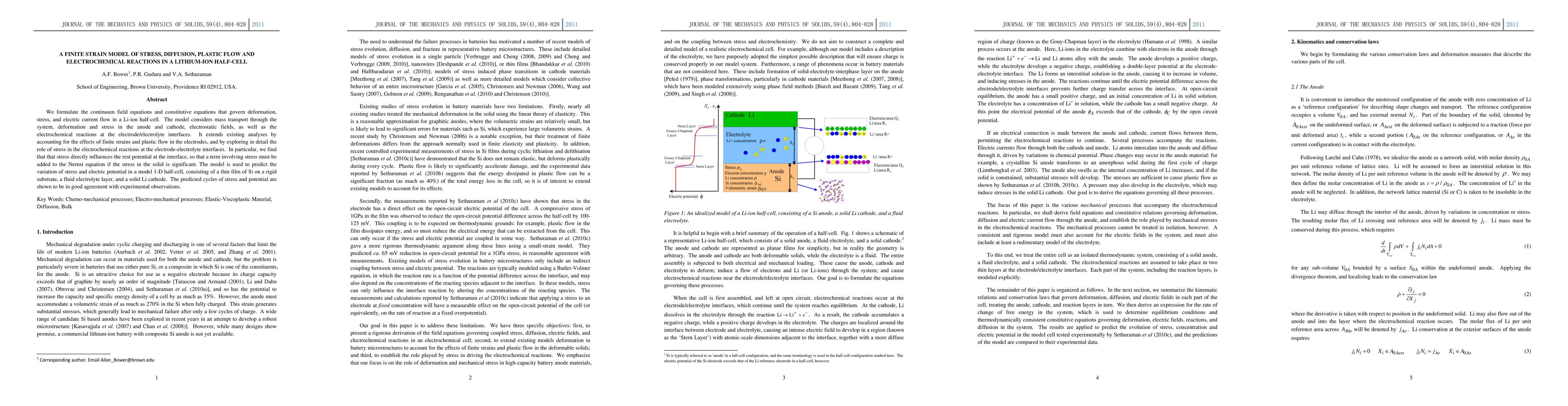 This paper develops a finite strain model for a lithium-ion half-cell, incorporating stress, diffusion, plastic flow, and electrochemical reactions. It finds that stress influences the rest potential at electrode interfaces, necessitating a stress term in the Nernst equation for significant solid stress, and validates the model against experimental data.