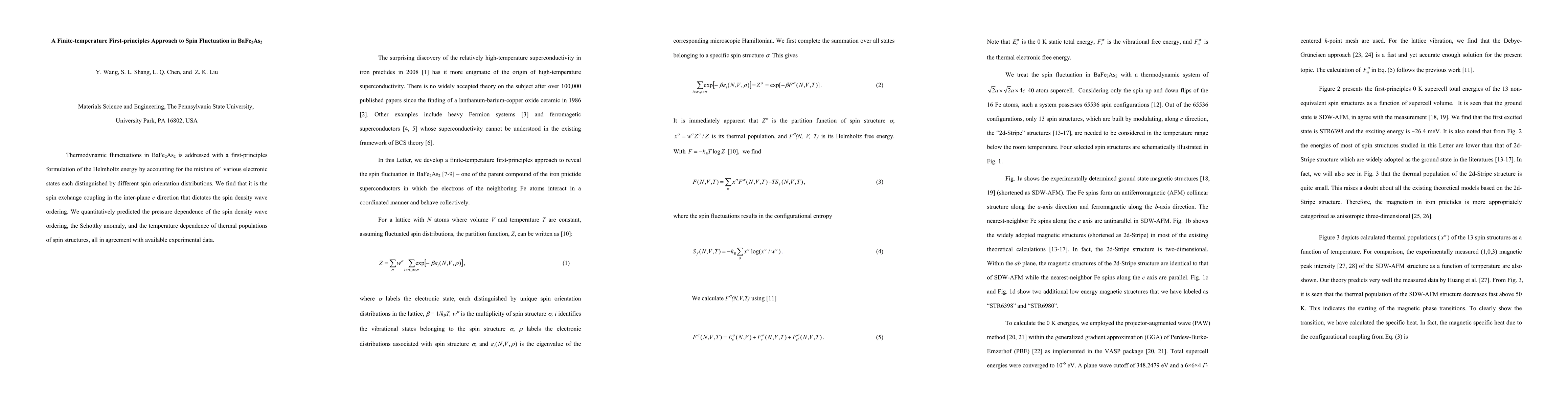 Thermodynamic flunctuations in BaFe2As2 is addressed with a first-principles formulation of the Helmholtz energy by accounting for the mixture of various electronic states each distinguished by different spin orientation distributions. We find that it is the spin exchange coupling in the inter-plane c direction that dictates the spin density wave ordering. We quantitatively predicted the pressure dependence of the spin density wave ordering, the Schottky anomaly, and the temperature dependence of thermal populations of spin structures, all in agreement with available experimental data.