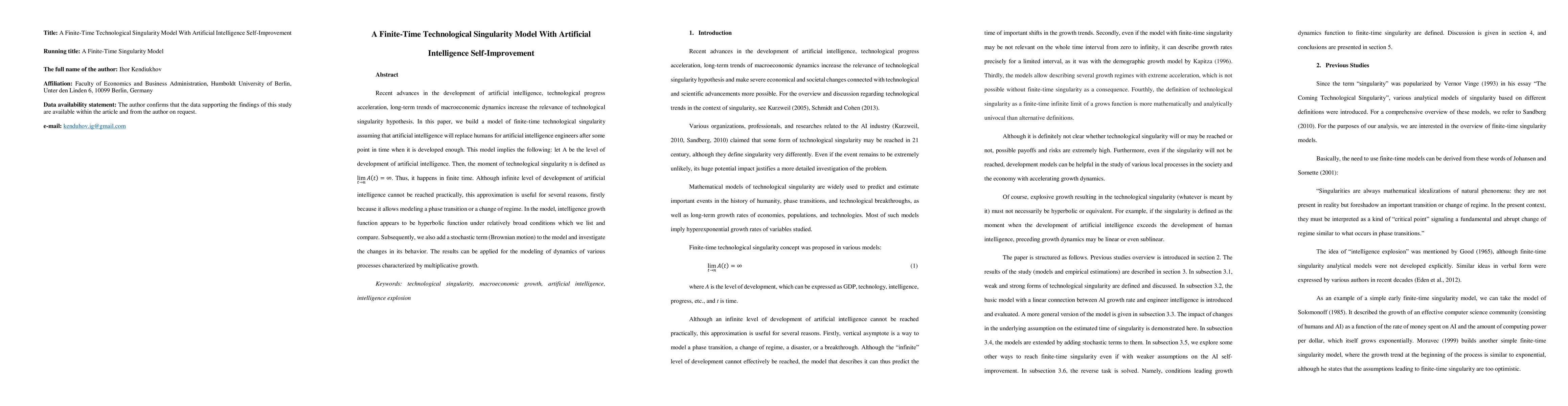 Recent advances in the development of artificial intelligence, technological progress acceleration, long-term trends of macroeconomic dynamics increase the relevance of technological singularity hypothesis. In this paper, we build a model of finite-time technological singularity assuming that artificial intelligence will replace humans for artificial intelligence engineers after some point in time when it is developed enough. This model implies the following: let A be the level of development of artificial intelligence. Then, the moment of technological singularity n is defined as the point in time where artificial intelligence development function approaches infinity. Thus, it happens in finite time. Although infinite level of development of artificial intelligence cannot be reached practically, this approximation is useful for several reasons, firstly because it allows modeling a phase transition or a change of regime. In the model, intelligence growth function appears to be hyperbolic function under relatively broad conditions which we list and compare. Subsequently, we also add a stochastic term (Brownian motion) to the model and investigate the changes in its behavior. The results can be applied for the modeling of dynamics of various processes characterized by multiplicative growth.