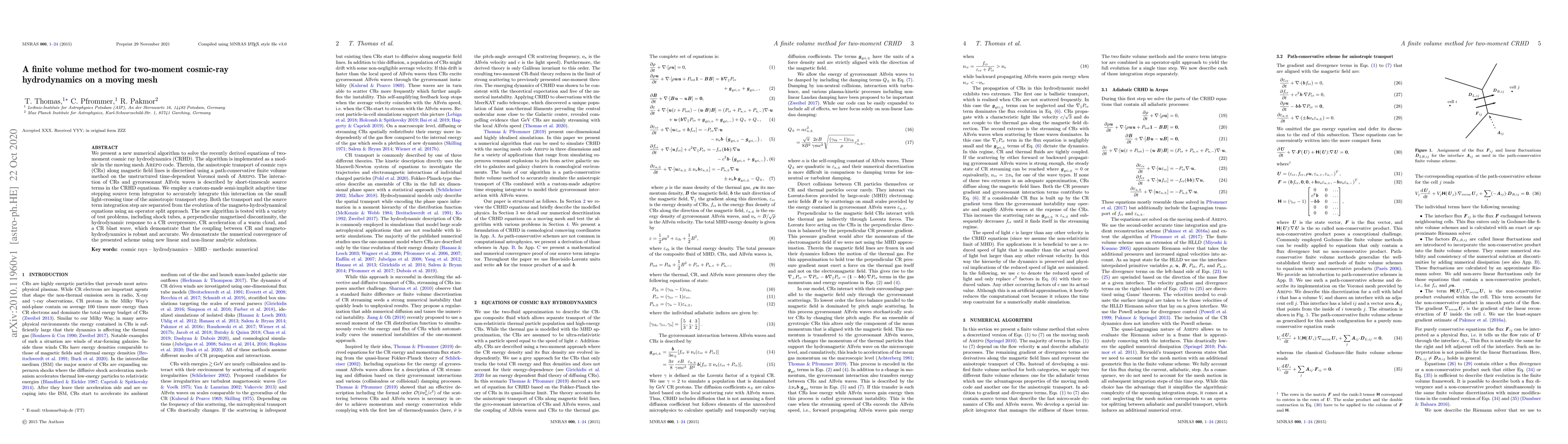 This paper introduces a new finite volume method for solving two-moment cosmic ray hydrodynamics equations within the Arepo code, employing a path-conservative approach on a moving mesh. The algorithm accurately captures the anisotropic transport of cosmic rays and their interaction with Alfv\'en waves using a semi-implicit adaptive time stepping method, validated through various test problems.