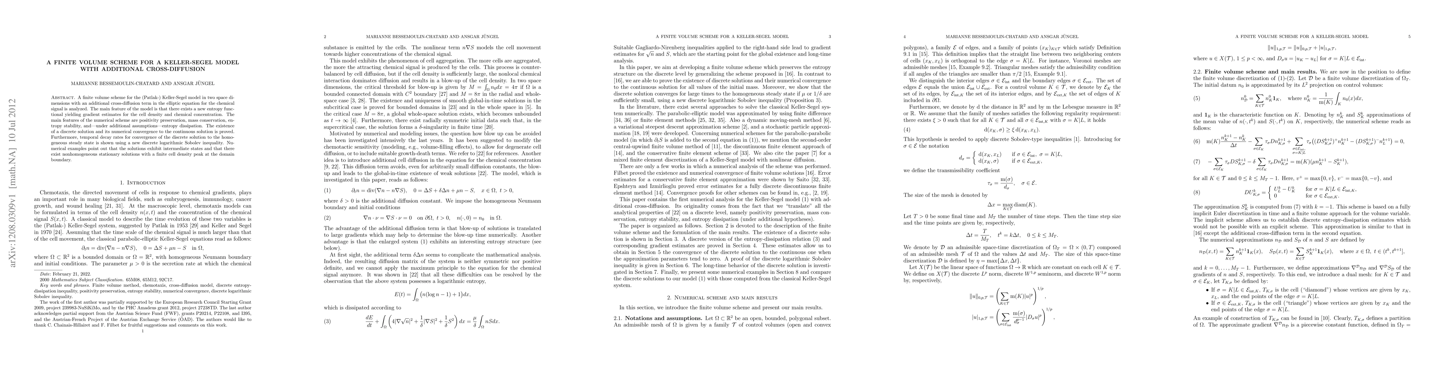 This paper proposes a finite volume scheme for a Keller-Segel model with cross-diffusion, ensuring positivity, mass conservation, and entropy stability. The scheme demonstrates convergence to the continuous solution and exhibits nonhomogeneous stationary states with peak cell density at the domain boundary.