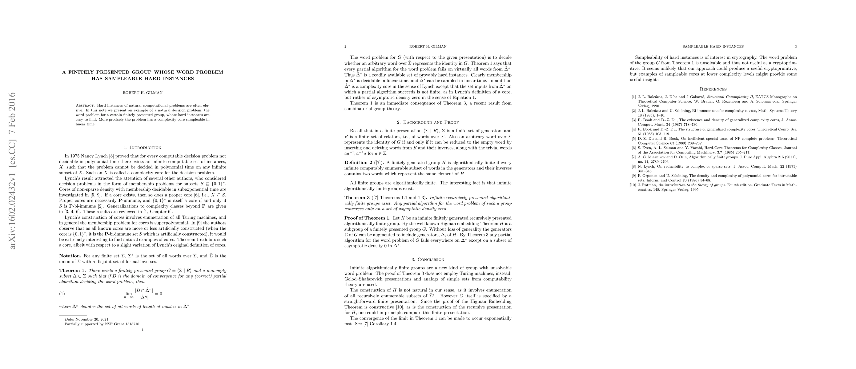 Summary: This paper presents a finitely presented group where the word problem's hard instances can be easily sampled, demonstrating that such difficult instances can arise naturally and are efficiently generable in linear time.