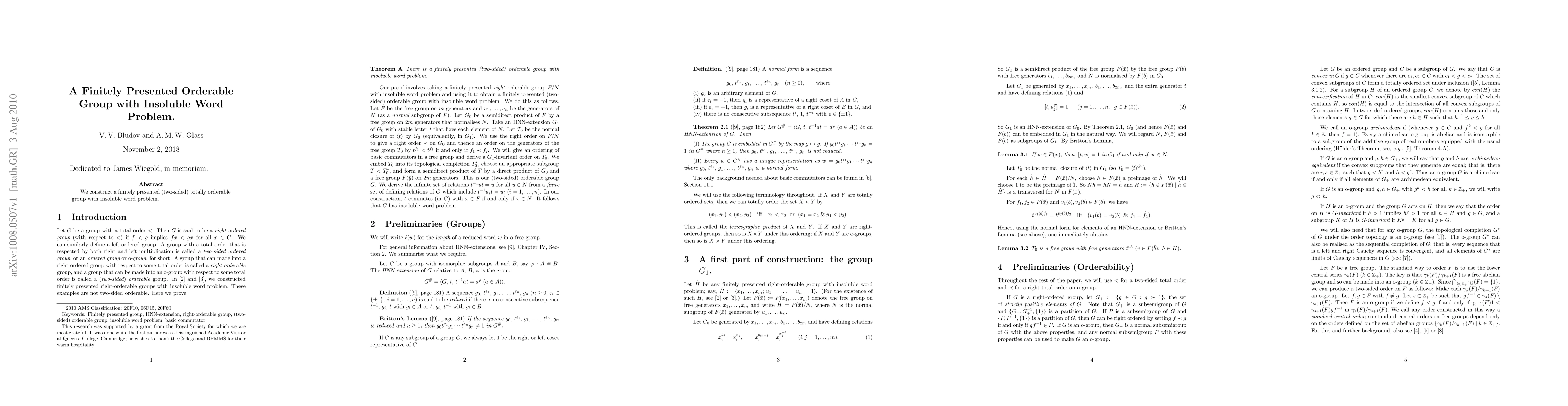 This paper constructs a finitely presented totally orderable group where determining whether a given word represents the identity element cannot be algorithmically solved. This demonstrates that the word problem for such groups can be unsolvable despite the group's presentation.