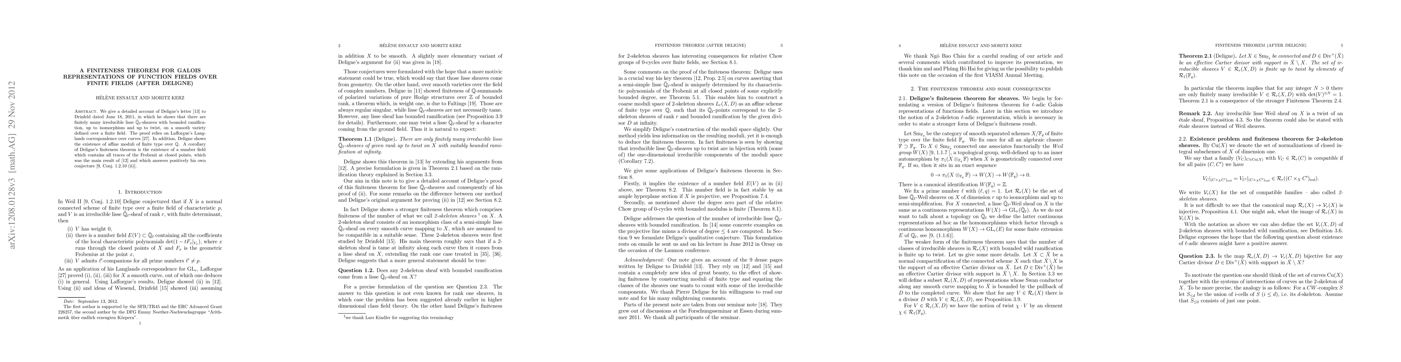 Revised: just some typos, reorganized a bit the article. It will be published in the VIASM Annual meeting, Hanoi. We give a detailed account of Deligne's letter to Drinfeld dated June 18, 2011, in which he shows that there are finitely many irreducible lisse $\bar \Q_\ell$-sheaves with bounded ramification, up to isomorphism and up to twist, on a smooth variety defined over a finite field. The proof relies on Lafforgue's Langlands correspondence over curves. In addition, Deligne shows the existence of affine moduli of finite type over $\mathbb{Q}$. A corollary of Deligne's finiteness theorem is the existence of a number field which contains all traces of the Frobenii at closed points, which was the main result of his recent article and which answers positively his own conjecture from Weil II.