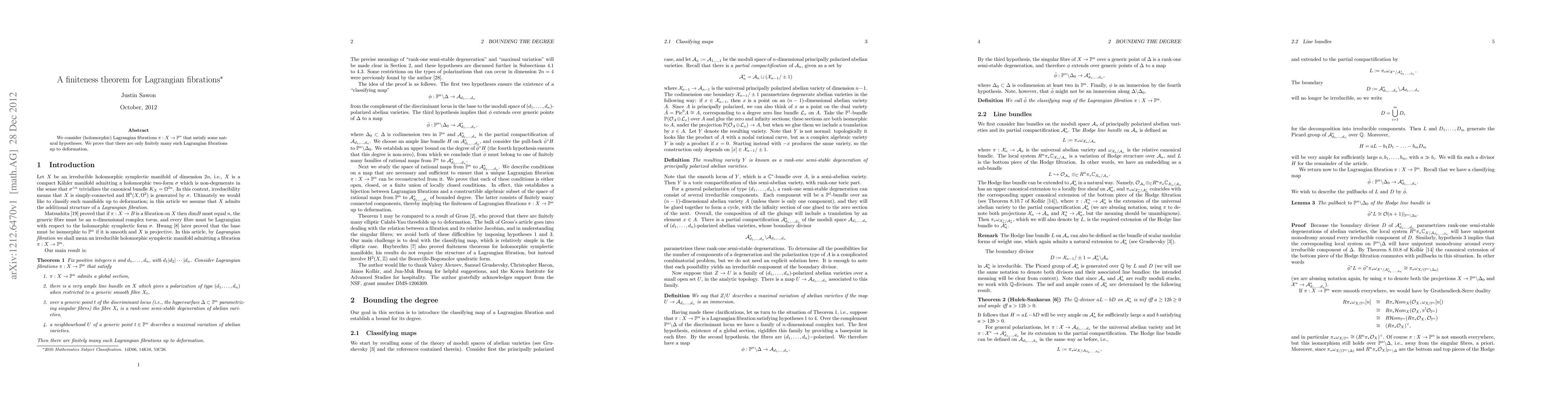 The paper establishes a finiteness theorem showing that (holomorphic) Lagrangian fibrations from a complex manifold X to projective space P^n, under certain conditions, can only exist in a finite number of distinct deformation classes. This result underscores the limited variety of such fibrations.