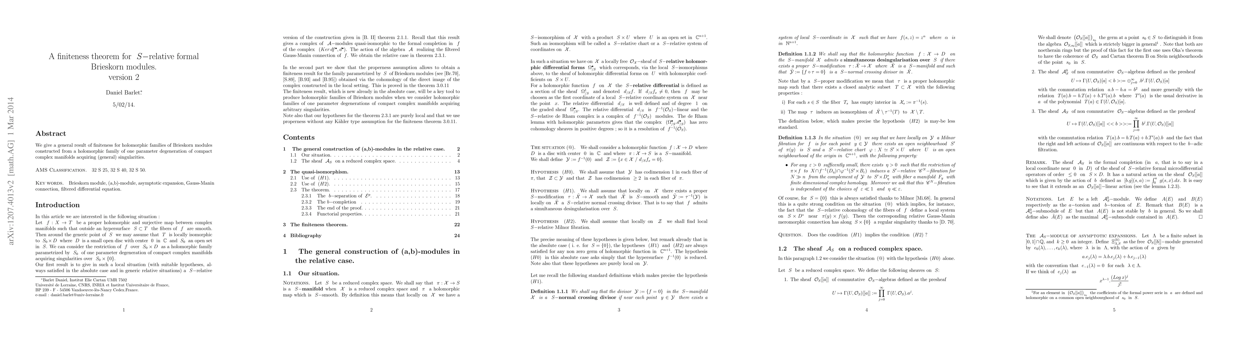 We give a general result of finiteness for holomorphic families of Brieskorn modules constructed from a holomorphic family of one parameter degeneration of compact complex manifolds acquiring (general) singularities.