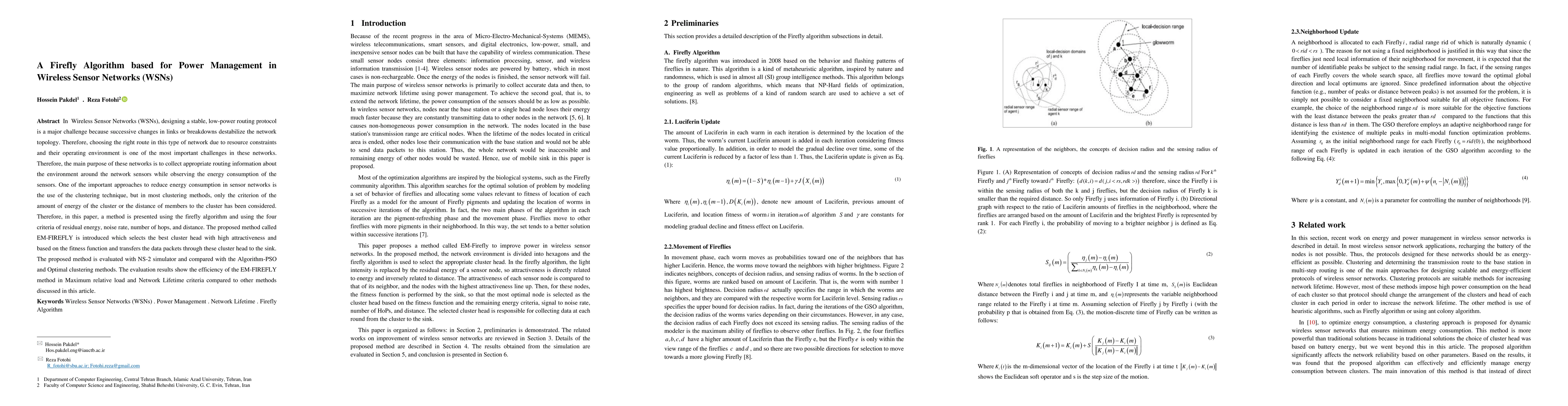 This paper proposes the EM-FIREFLY method using the firefly algorithm to optimize power management in wireless sensor networks (WSNs) by selecting the best cluster head based on residual energy, noise rate, number of hops, and distance. Evaluations using NS-2 simulator show that EM-FIREFLY outperforms PSO and optimal clustering methods in terms of relative load and network lifetime.
