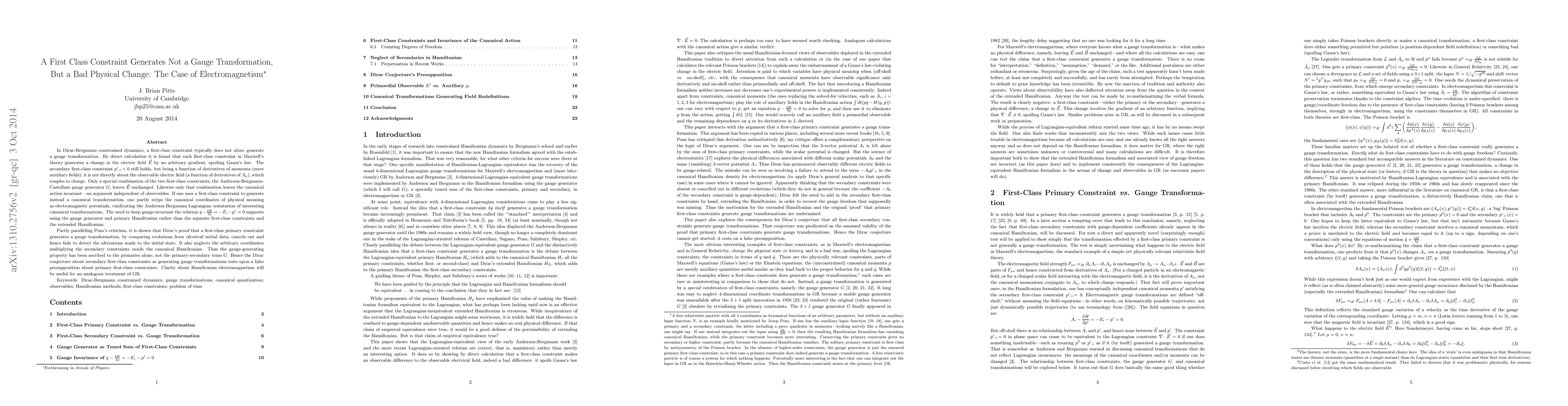 In Dirac-Bergmann constrained dynamics, a first-class constraint typically does not _alone_ generate a gauge transformation. Each first-class constraint in Maxwell's theory generates a change in the electric field E by an arbitrary gradient, spoiling Gauss's law. The secondary constraint p^i,_i=0 still holds, but being a function of derivatives of momenta (mere auxiliary fields), it is not directly about the observable electric field (a function of derivatives of A), which couples to charge. Only a special combination of the two first-class constraints, the Anderson-Bergmann-Castellani gauge generator G, leaves E unchanged. Likewise only that combination leaves the canonical action invariant---an argument independent of observables. If one uses a first-class constraint to generate instead a canonical transformation, one partly strips the canonical coordinates of physical meaning as electromagnetic potentials, vindicating the Anderson-Bergmann Lagrangian orientation of interesting canonical transformations. The need to keep gauge-invariant q,t-dH/dp=-E-p=0 supports using the gauge generator and primary Hamiltonian rather than the separate first-class constraints and the extended Hamiltonian. Partly paralleling Pons's criticism, it is shown that Dirac's proof that a first-class primary constraint generates a gauge transformation, by comparing evolutions from _identical_ initial data, cancels out and hence fails to detect the alterations made to the initial state. It also neglects the arbitrary coordinates multiplying the secondary constraints _inside_ the canonical Hamiltonian. Thus the gauge-generating property has been ascribed to the primaries alone. Hence the Dirac conjecture about secondary first-class constraints as generating gauge transformations rests upon a false presupposition about primary first-class constraints. Clarity about electromagnetism help with GR.