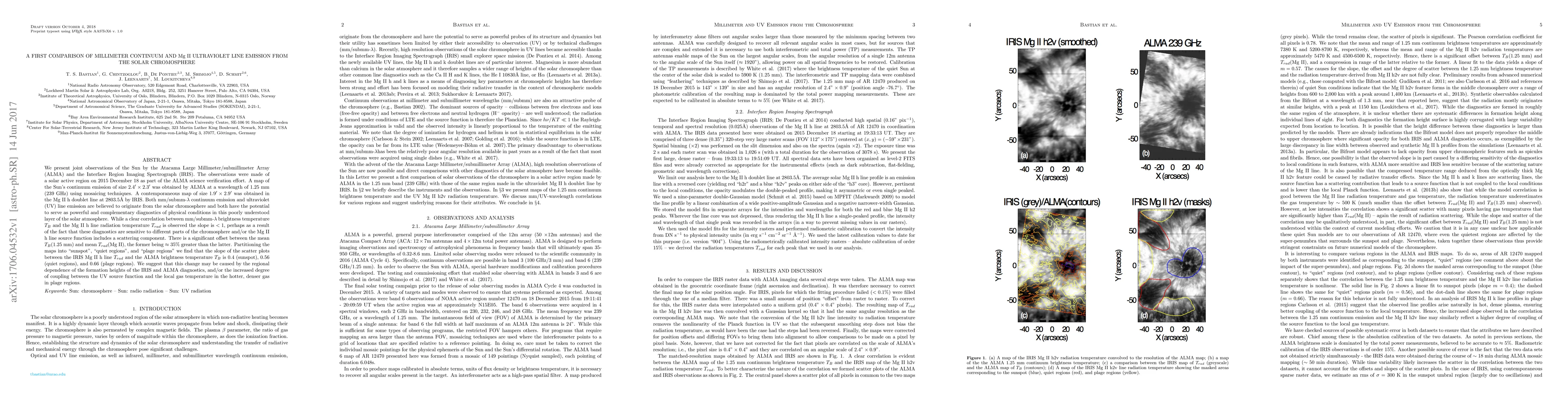 We present joint observations of the Sun by the Atacama Large Millimeter/submillimeter Array (ALMA) and the Interface Region Imaging Spectrograph (IRIS). The observations were made of a solar active region on 2015 December 18 as part of the ALMA science verification effort. A map of the Sun's continuum emission of size $2.4' \times 2.3'$ was obtained by ALMA at a wavelength of 1.25 mm (239 GHz) using mosaicing techniques. A contemporaneous map of size $1.9'\times 2.9'$ was obtained in the Mg II h doublet line at 2803.5\AA\ by IRIS. Both mm/submm$-\lambda$ continuum emission and ultraviolet (UV) line emission are believed to originate from the solar chromosphere and both have the potential to serve as powerful and complementary diagnostics of physical conditions in this poorly understood layer of the solar atmosphere. While a clear correlation between mm-$\lambda$ brightness temperature $T_B$ and the Mg II h line radiation temperature $T_{rad}$ is observed the slope is $<1$, perhaps as a result of the fact that these diagnostics are sensitive to different parts of the chromosphere and/or the Mg II h line source function includes a scattering component. There is a significant offset between the mean $T_B$(1.25 mm) and mean $T_{rad}$(Mg II), the former being $\approx 35\%$ greater than the latter. Partitioning the maps into "sunspot", "quiet regions", and "plage regions" we find that the slope of the scatter plots between the IRIS Mg II h line $T_{rad}$ and the ALMA brightness temperature $T_B$ is 0.4 (sunspot), 0.56 (quiet regions), and 0.66 (plage regions). We suggest that this change may be caused by the regional dependence of the formation heights of the IRIS and ALMA diagnostics, and/or the increased degree of coupling between the UV source function and the local gas temperature in the hotter, denser gas in plage regions.