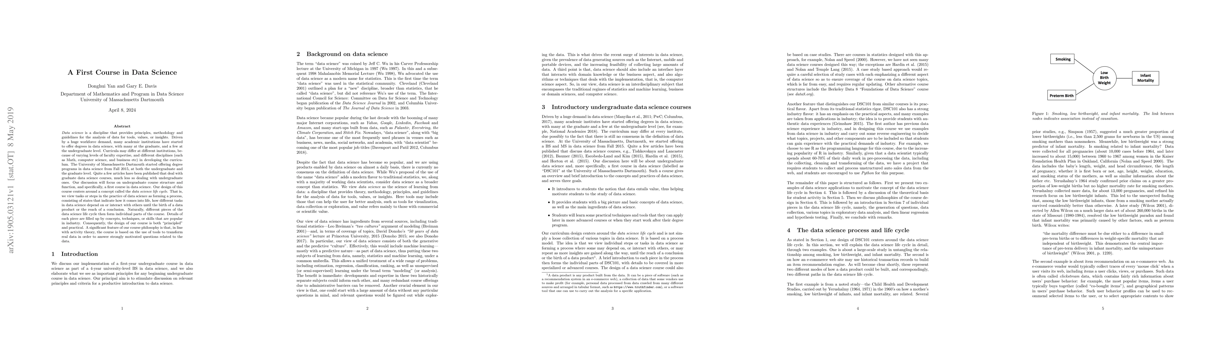 This paper discusses the design of an undergraduate first course in data science at the University of Massachusetts Dartmouth, focusing on the data science life cycle as a central concept. The course emphasizes practical skills and real-world data analysis, integrating industry-relevant techniques to foster both theoretical understanding and hands-on experience.