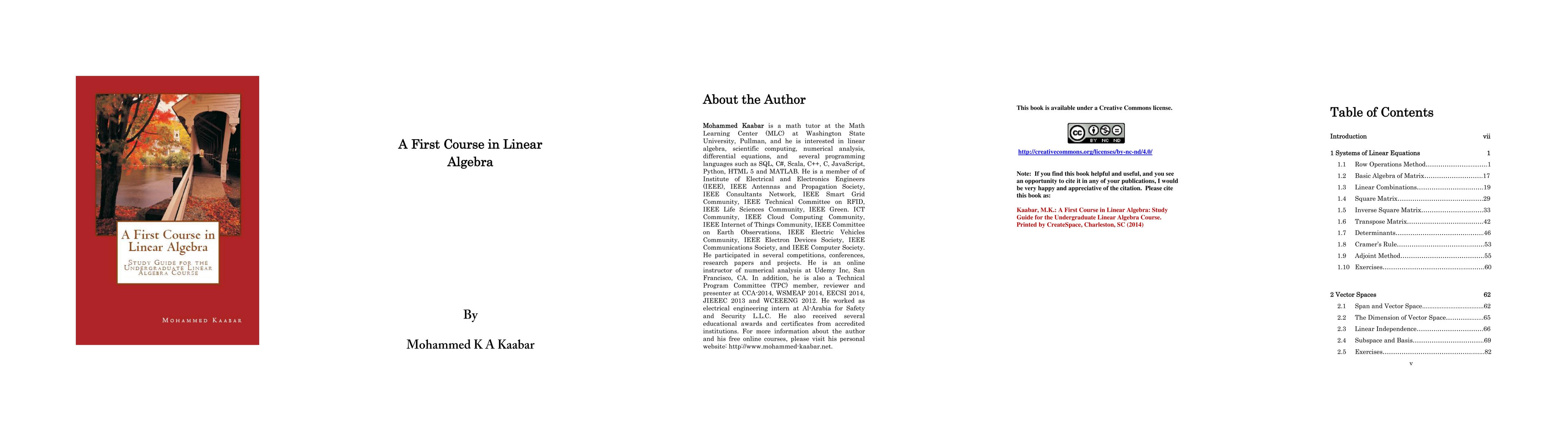 In this book, there are five chapters: Systems of Linear Equations, Vector Spaces, Homogeneous Systems, Characteristic Equation of Matrix, and Matrix Dot Product. It has also exercises at the end of each chapter above to let students practice additional sets of problems other than examples, and they can also check their solutions to some of these exercises by looking at Answers to Odd-Numbered Exercises section at the end of this book. This book is very useful for college students who studied Calculus I, and other students who want to review some linear algebra concepts before studying a second course in linear algebra. This book is available online for free in google books and ResearchGate in PDF format under a Creative Commons license.