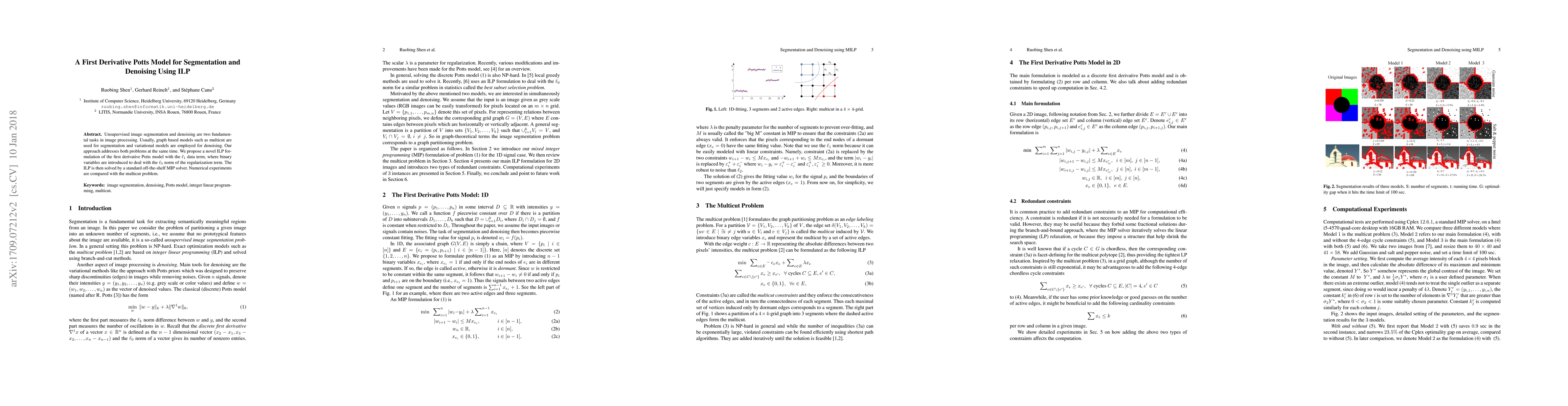 Unsupervised image segmentation and denoising are two fundamental tasks in image processing. Usually, graph based models such as multicut are used for segmentation and variational models are employed for denoising. Our approach addresses both problems at the same time. We propose a novel ILP formulation of the first derivative Potts model with the $\ell_1$ data term, where binary variables are introduced to deal with the $\ell_0$ norm of the regularization term. The ILP is then solved by a standard off-the-shelf MIP solver. Numerical experiments are compared with the multicut problem.