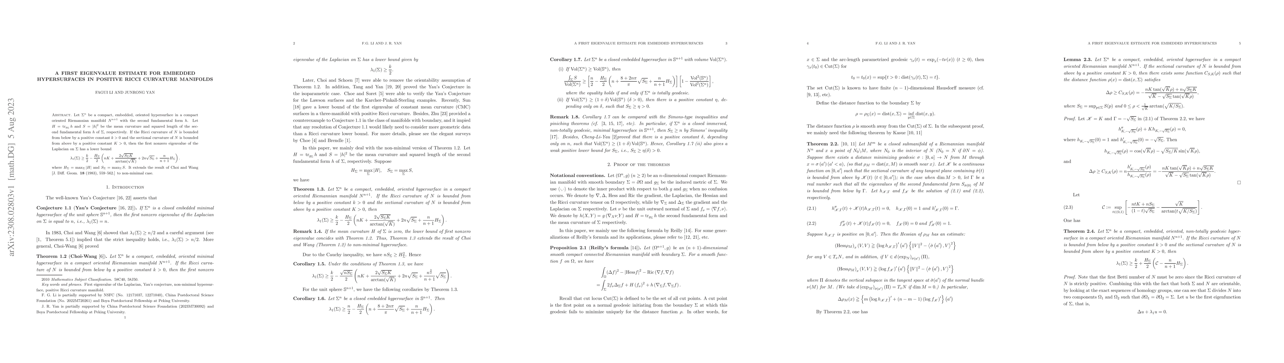 This paper establishes a lower bound for the first nonzero eigenvalue of the Laplacian on an embedded hypersurface in a Riemannian manifold with positive Ricci curvature. The result extends previous work by Choi and Wang to cases where the hypersurface is not minimal.