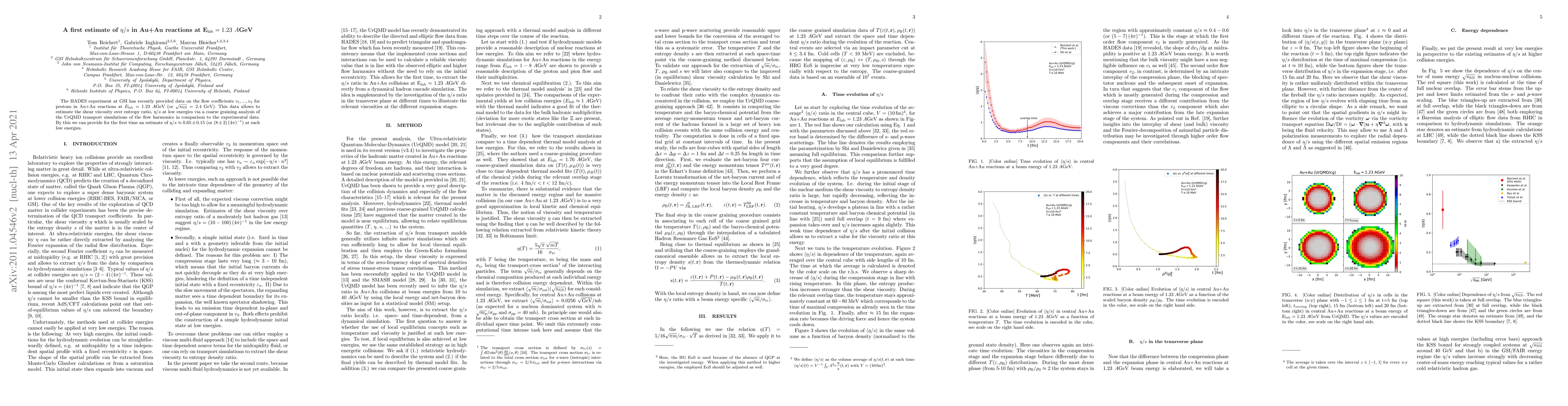 The HADES experiment at GSI has recently provided data on the flow coefficients $v_1,...,v_4$ for protons in Au+Au reactions at $E_{\rm lab} = 1.23$~$A$GeV (or $\sqrt{s_\mathrm{NN}}=2.4$ GeV). This data allows to estimate the shear viscosity over entropy ratio, $\eta/s$ at low energies via a coarse graining analysis of the UrQMD transport simulations of the flow harmonics in comparison to the experimental data. By this we can provide for the first time an estimate of $\eta/s\approx0.65\pm0.15$ (or $(8\pm2)\,(4\pi)^{-1}$) at such low energies.