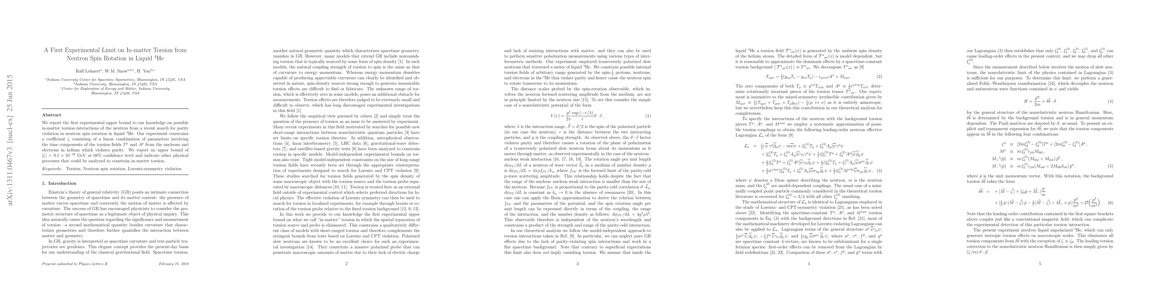 We report the first experimental upper bound to our knowledge on possible in-matter torsion interactions of the neutron from a recent search for parity violation in neutron spin rotation in liquid He-4. Our experiment constrains a coefficient $\zeta$ consisting of a linear combination of parameters involving the time components of the torsion fields $T^\mu$ and $A^\mu$ from the nucleons and electrons in helium which violates parity. We report an upper bound of $|\zeta|<9.1x10^{-23}$ GeV at 68% confidence level and indicate other physical processes that could be analyzed to constrain in-matter torsion.