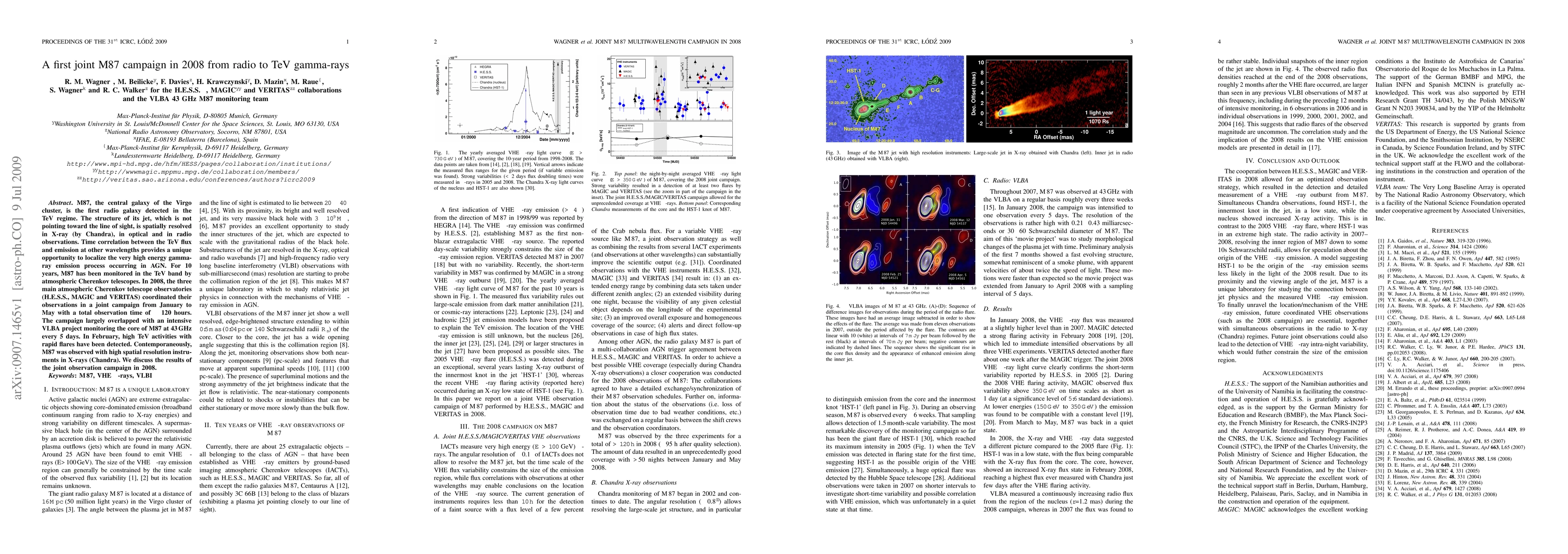M87, the central galaxy of the Virgo cluster, is the first radio galaxy detected in the TeV regime. The structure of its jet, which is not pointing toward the line of sight, is spatially resolved in X-ray (by Chandra), in optical and in radio observations. Time correlation between the TeV flux and emission at other wavelengths provides a unique opportunity to localize the very high energy gamma-ray emission process occurring in AGN. For 10 years, M87 has been monitored in the TeV band by atmospheric Cherenkov telescopes. In 2008, the three main atmospheric Cherenkov telescope observatories (H.E.S.S., MAGIC and VERITAS) coordinated their observations in a joint campaign from January to May with a total observation time of approx. 120 hours. The campaign largely overlapped with an intensive VLBA project monitoring the core of M87 at 43 GHz every 5 days. In February, high TeV activities with rapid flares have been detected. Contemporaneously, M87 was observed with high spatial resolution instruments in X-rays (Chandra). We discuss the results of the joint observation campaign in 2008.