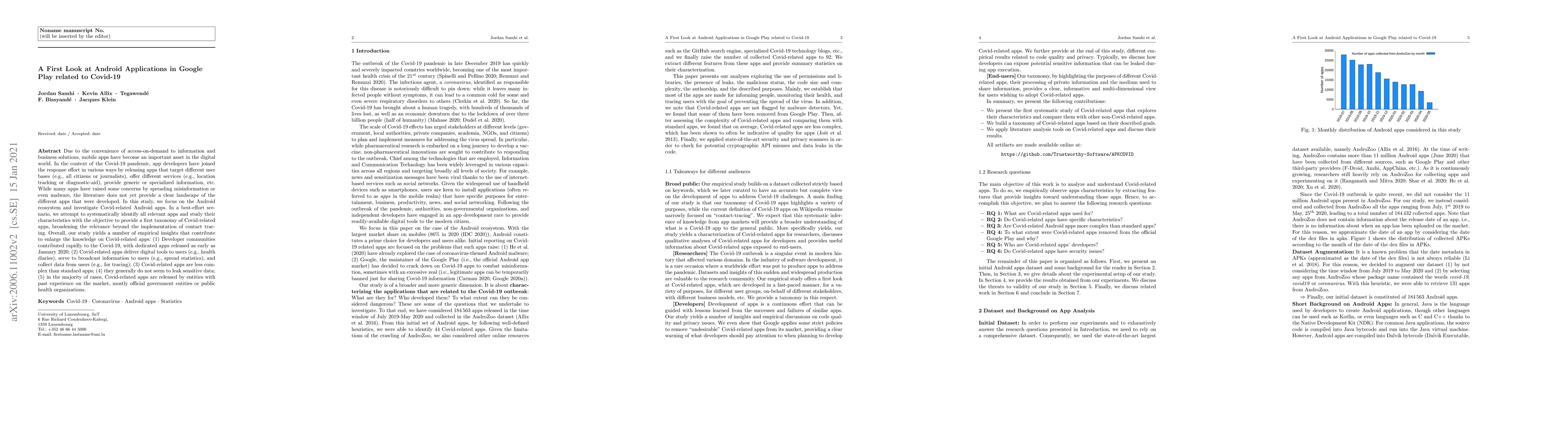 This study examines Covid-19 related Android apps in Google Play, revealing a rapid developer response starting in January 2020. The research identifies a taxonomy of these apps, highlighting their varied services, relative simplicity, and the prevalence of data collection and information dissemination, with most being released by experienced government or health organizations.