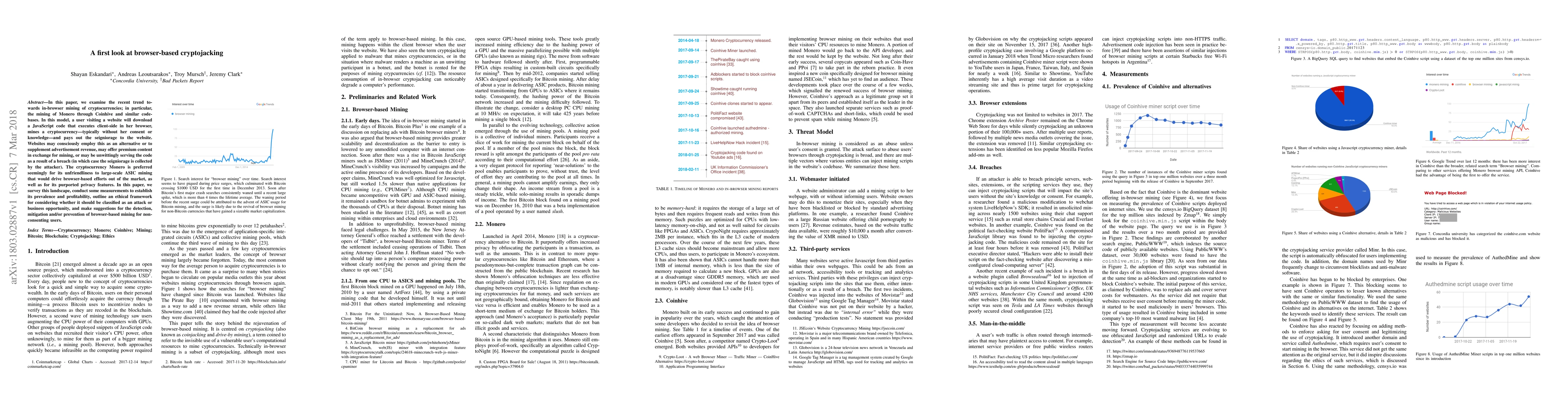 This paper investigates the rise of browser-based cryptojacking, focusing on Monero mining via Coinhive, where websites exploit users' browsers to mine cryptocurrencies without consent. It surveys the prevalence, ethical considerations, and proposes methods for detection and prevention.