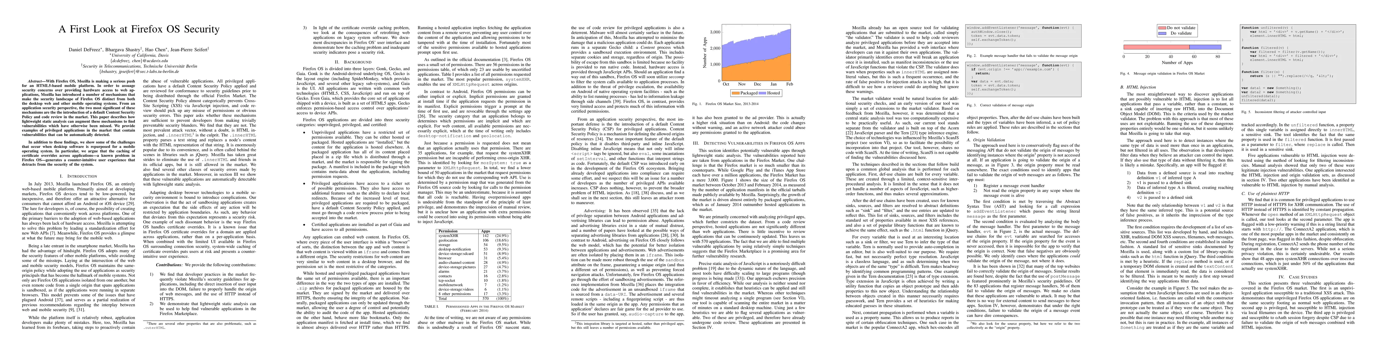 This paper examines the security mechanisms of Firefox OS, highlighting the use of a default Content Security Policy and code review to mitigate security risks. It demonstrates how lightweight static analysis can uncover vulnerabilities in privileged applications, and discusses challenges in repurposing desktop software for mobile, particularly the problematic caching of certificate overrides.